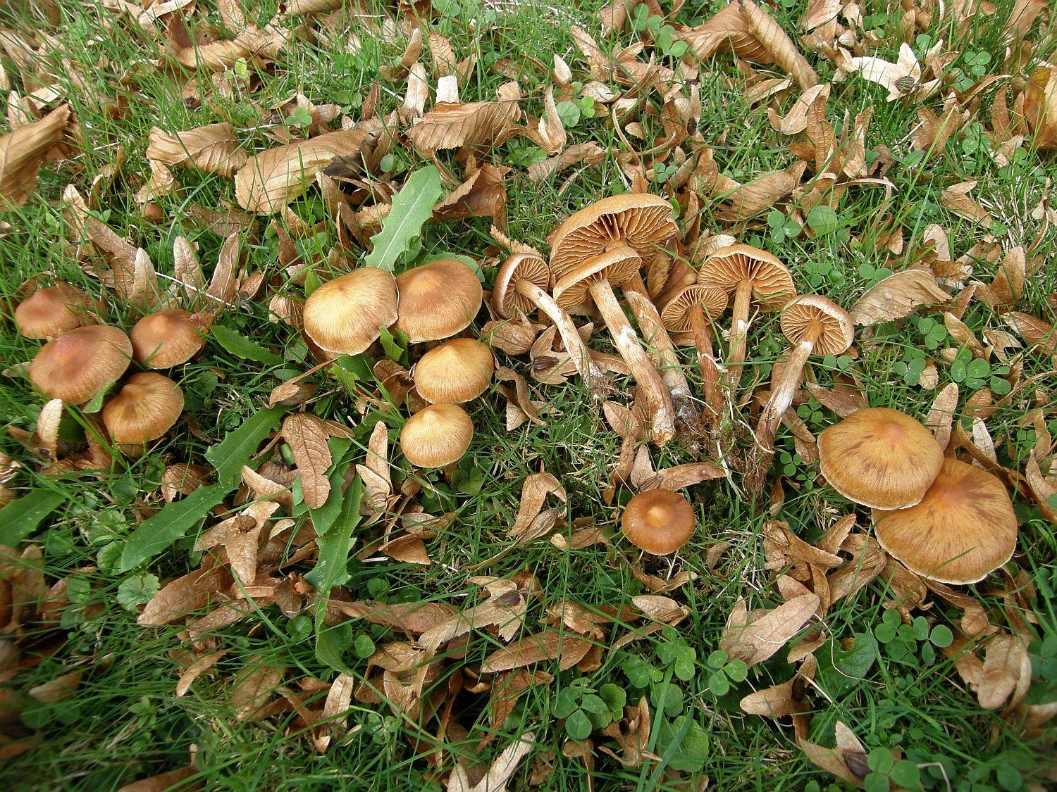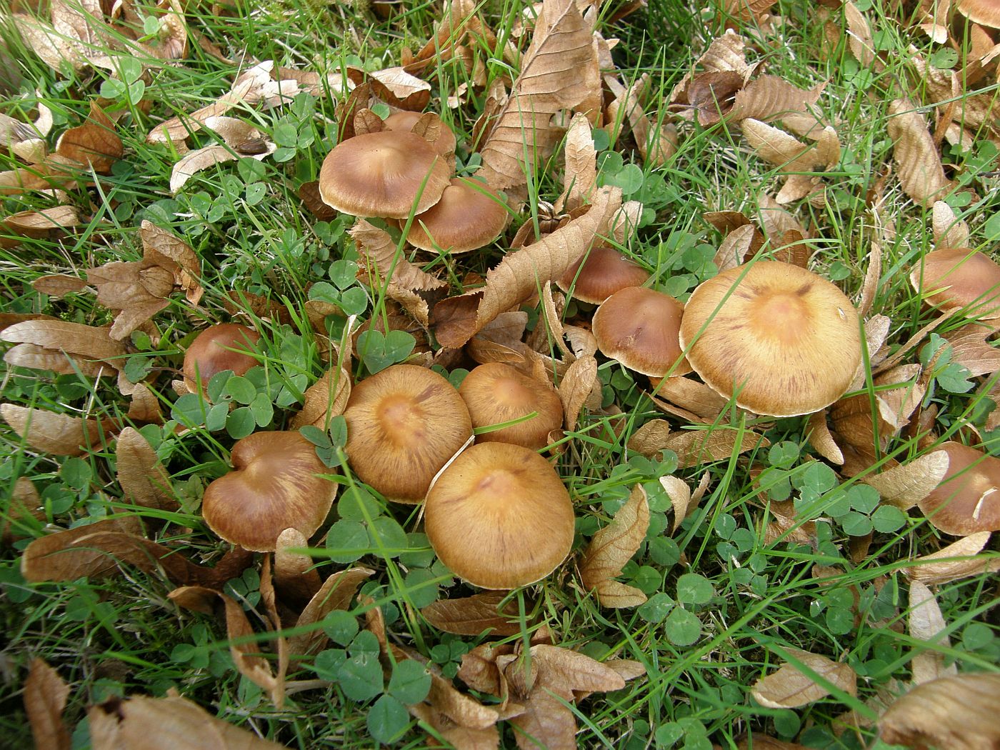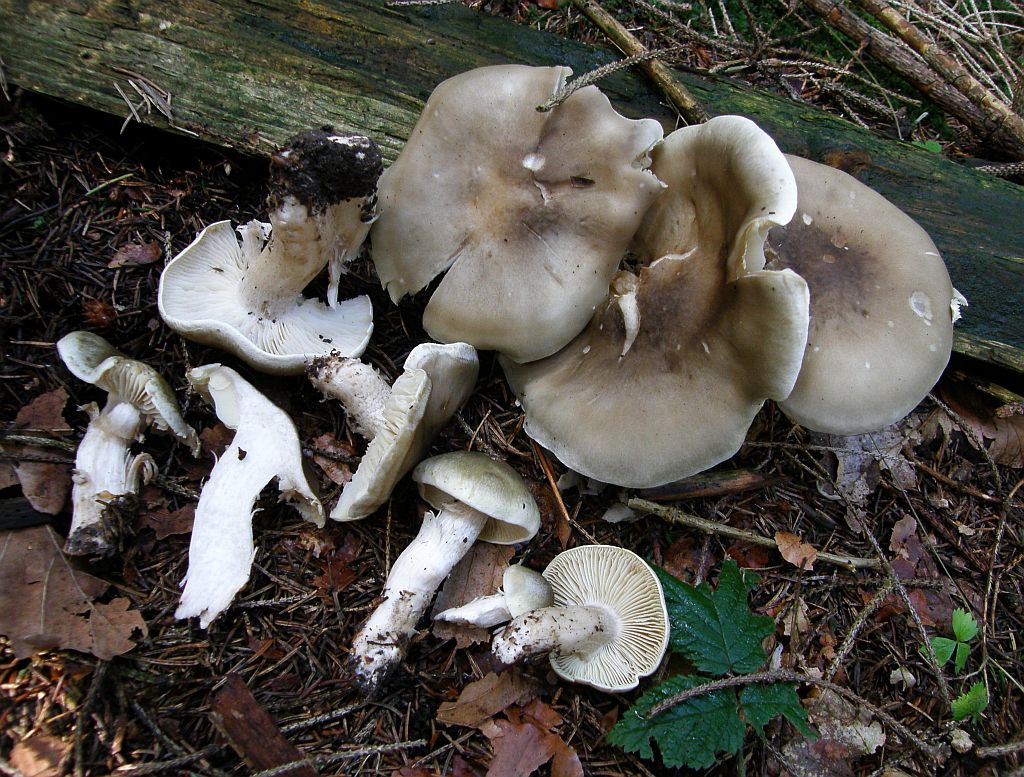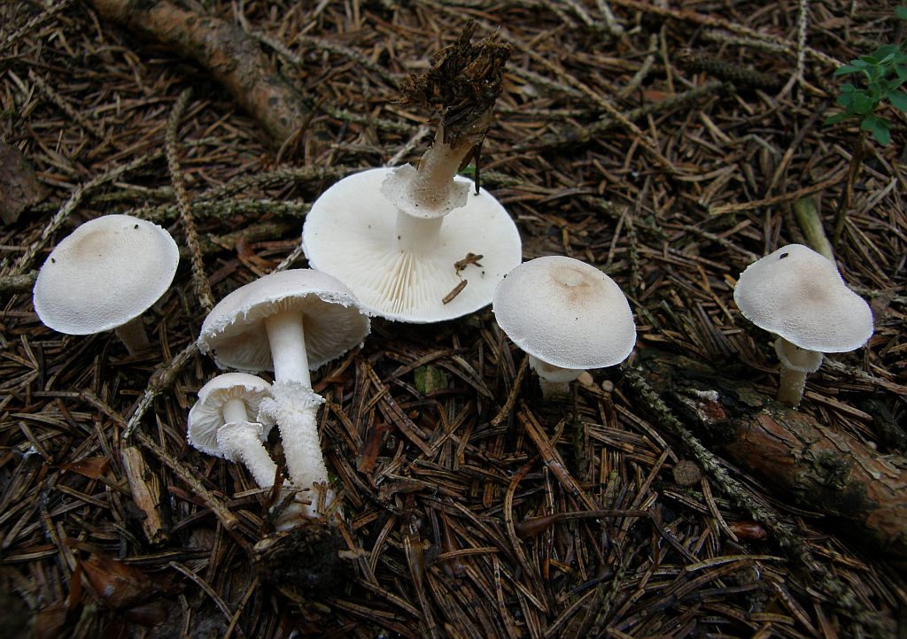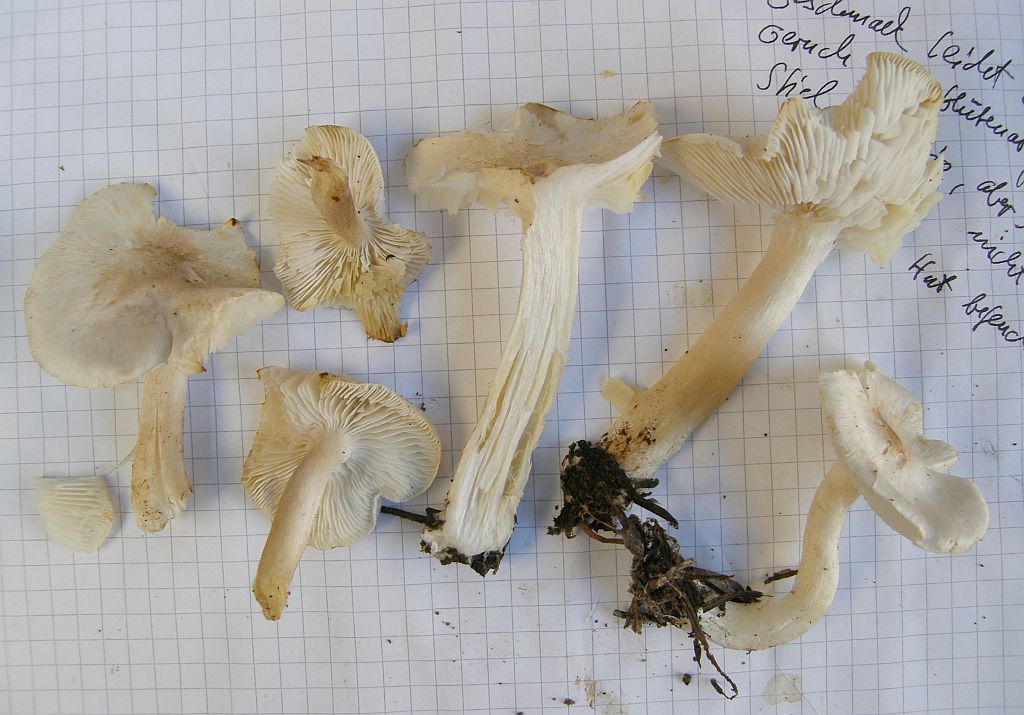 verwirrend, wegen dem Fundort unter zwei großen Tannen (Abies spec.) und der etwas übertriebenen Größe der Fruchtkörper. Ich hatte den bisher nur kleiner gesehen. Aber sie sind klassisch dünnfleischig, gilbend, extrös mehlgurkiger Geruch. Sporenform passt nicht zu Tricholoma scalpturatum, Tricholoma argyraceum gilbt noch weniger und hat noch mal einen Tik schlankere Sporen, wobei das vermutlich ein variables Merkmal ist. Mit den weißen fruchtkörpern und angesichts der Tatsache, daß der nächste laubbaum auf dem Gelände auch nie weiter als 6 bis 8 Meter entfernt steht, bleibe ich bei Tricholoma inocyboides.