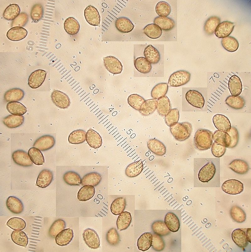 Am selben Standort wie Tricholoma inocyboides. Hutoberfläche zunächst etwas glänzig, aber trocken. Stieloberfläche trocken. beim Anfeuchten Hutoberfläche schmierig, dann bald wieder klebrig, dann trocken. Stieloberfläche wird beim Anfeuchten feucht, sonst tut sich nix. Dennoch bringe ich den nirgends sonst unter außer bei Myxacium. Die Sporen machen mich auch konfus, die sind nämlich fast glatt. Die sehr feinen Warzen sind mit meiner Ausrüstung nicht mehr abzubilden, also ungefähr wie bei Ramaria stricta. Wenn ich Myxacium schlüssele, komme ich im Grunde nur bei der Art raus, die beiden Nachbararten müssten beim Anfeuchten deutlicher schleimig werden.