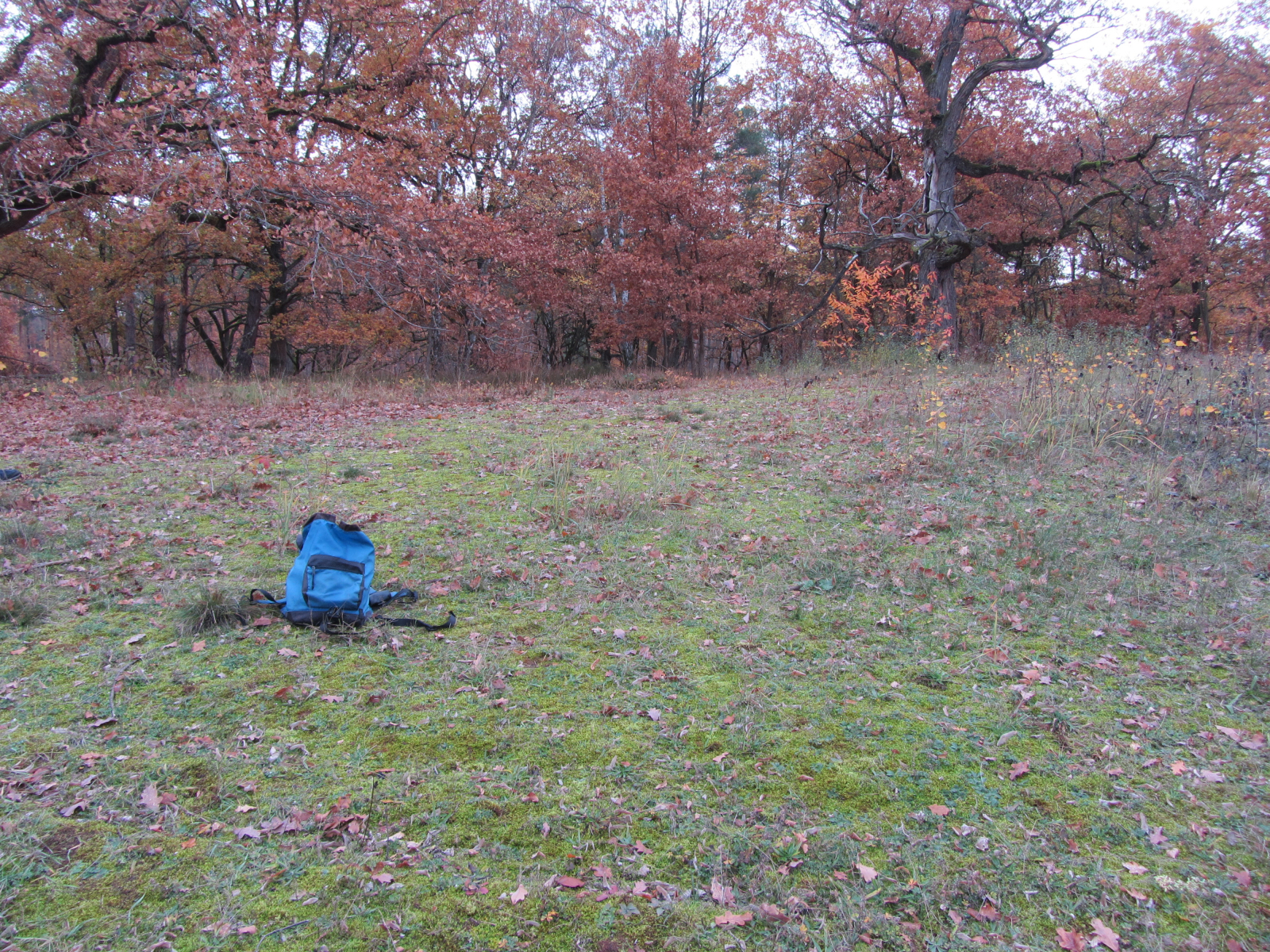 Die stehen auf der Kuppe einer Oberrheinischen Flugsanddüne, die teils mit alten Eichen, Kiefern und Rotbuchen bewachsen ist, teils aber auch mit krautigen Pflanzen, zwischen denen sich an offenen Stellen langsam sowas wie eine Sandtrockenrasengesellschaft entwickelt.