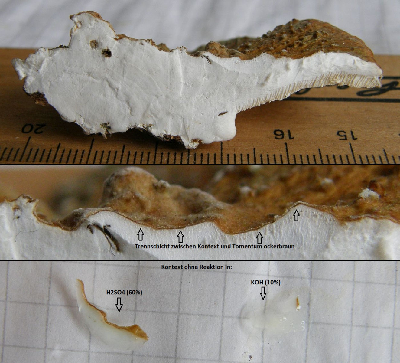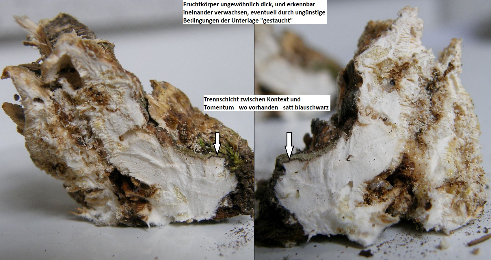 Mikroskopisch: Monomitisch, Hyphen sehr dicht, ineinander verklebt, substratnah etwas lockerer aber ohne differnziertes Subikulum (Hyphen in allen Bereichen +/- aufsteigend); alle Septen ohne Schnallen
