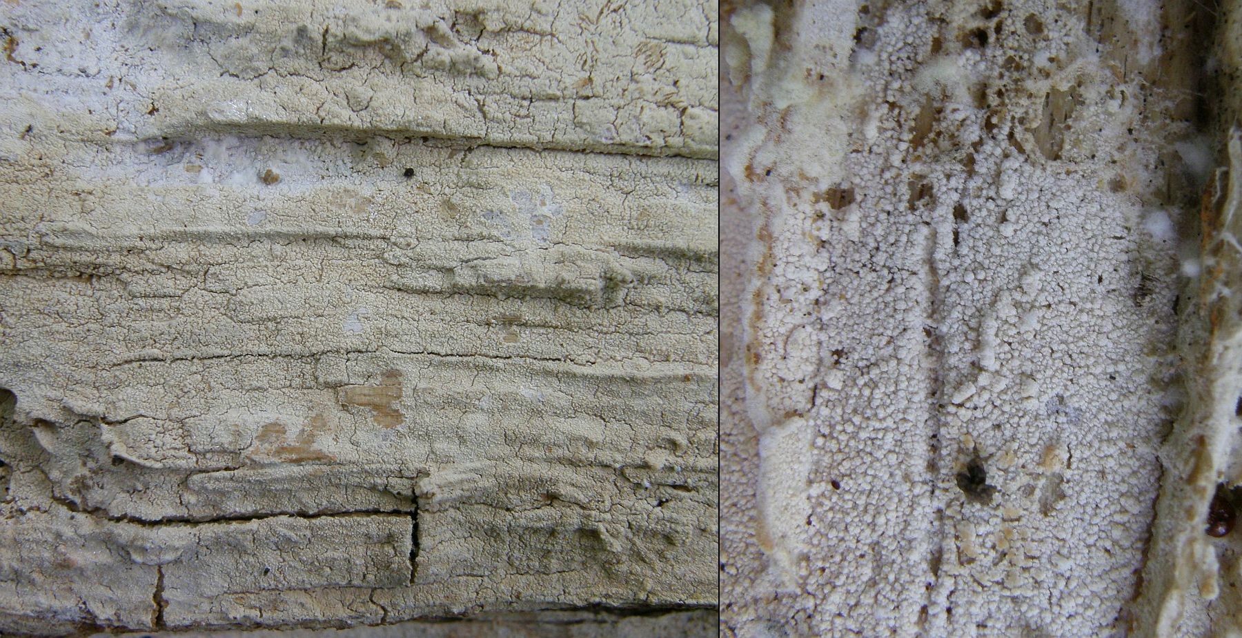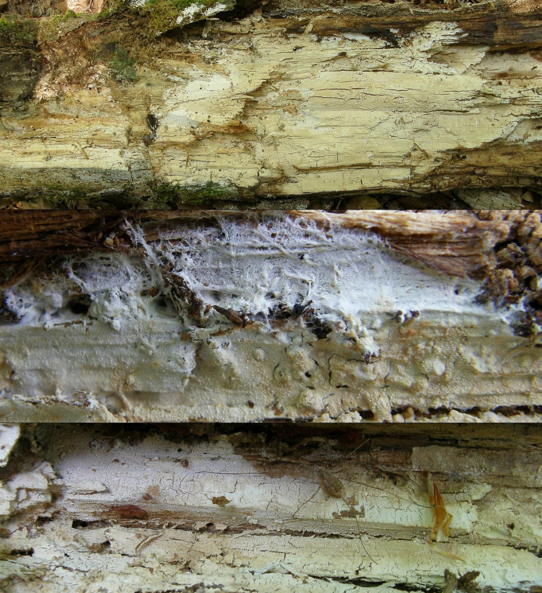Bilder 30 & 31 sowie 32 & 33 ("weißer Porling Fichte 2" und "weiß an Fichte 3") sind beides Antrodia serialis.