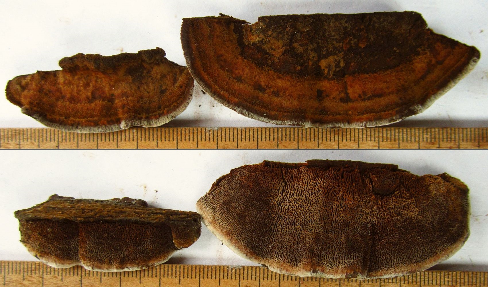 Der Fund danach (3) ist schon Trametes hirsuta. Trametes pubescens kann nicht solche Haare auf der Oberseite bilden. Sieht in der Tat nicht ganz typisch aus, passt aber noch gut in die Variationsbreite von Trametes hirsuta.