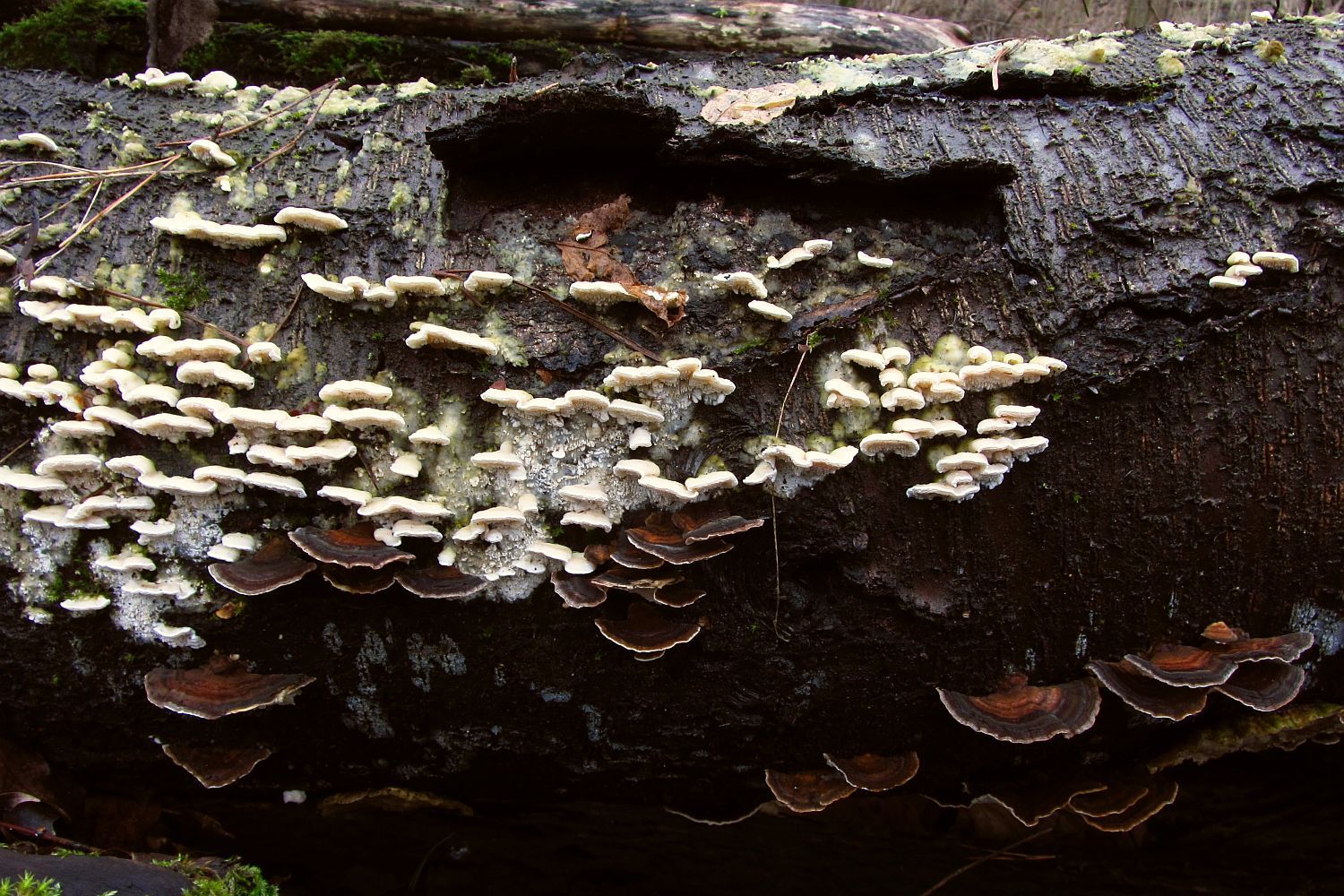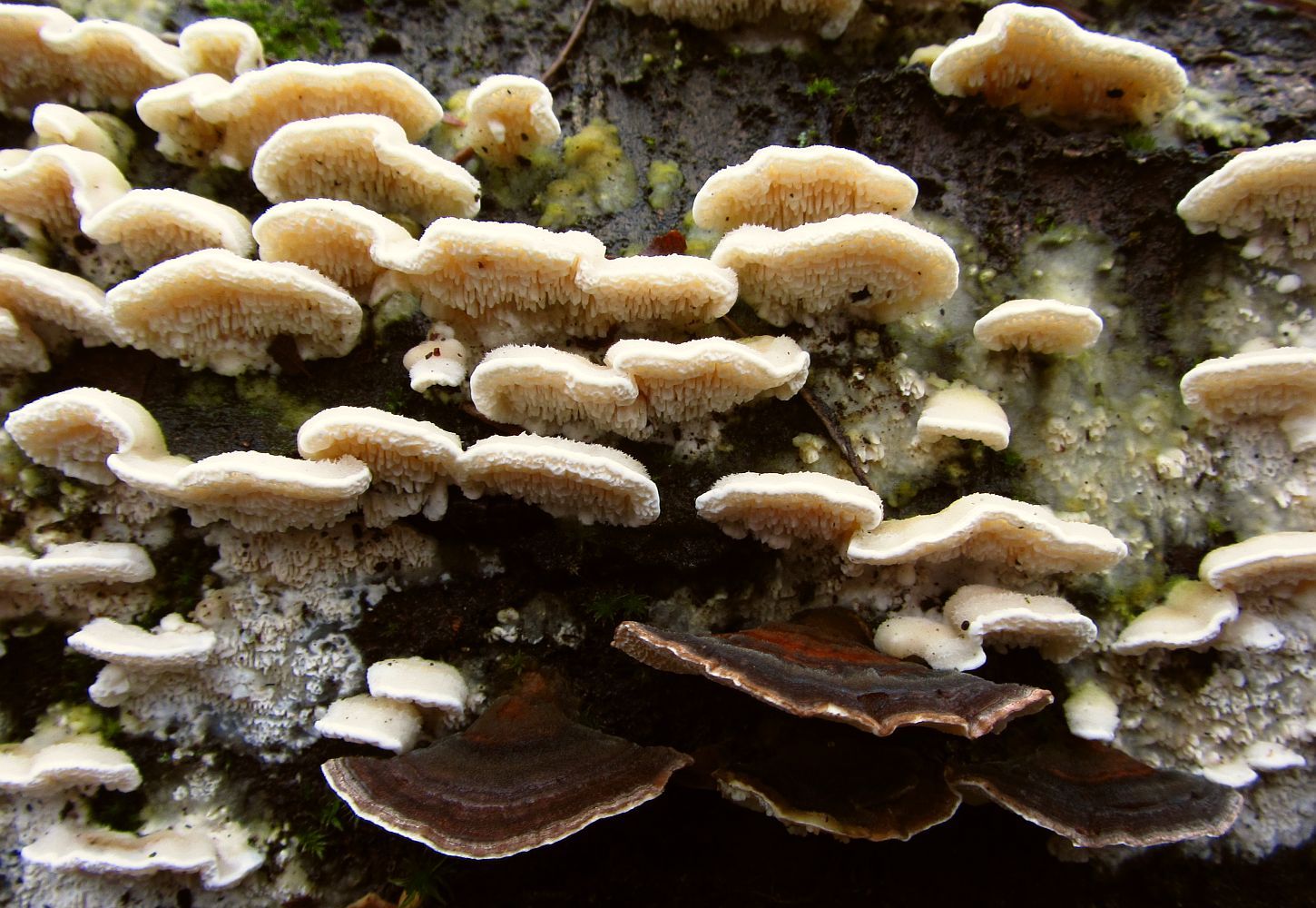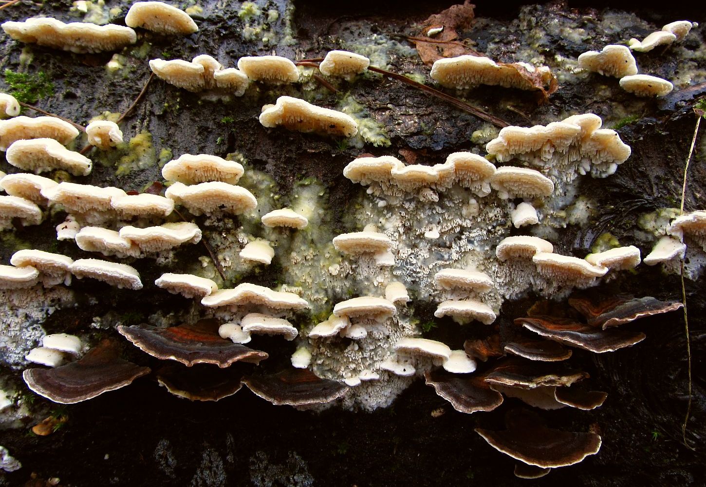 1) Irpex lacteus (Milchweißer Eggenpilz) zusammen mit Trametes versicolor (Schmetterlingstramete) an Prunus spec.: