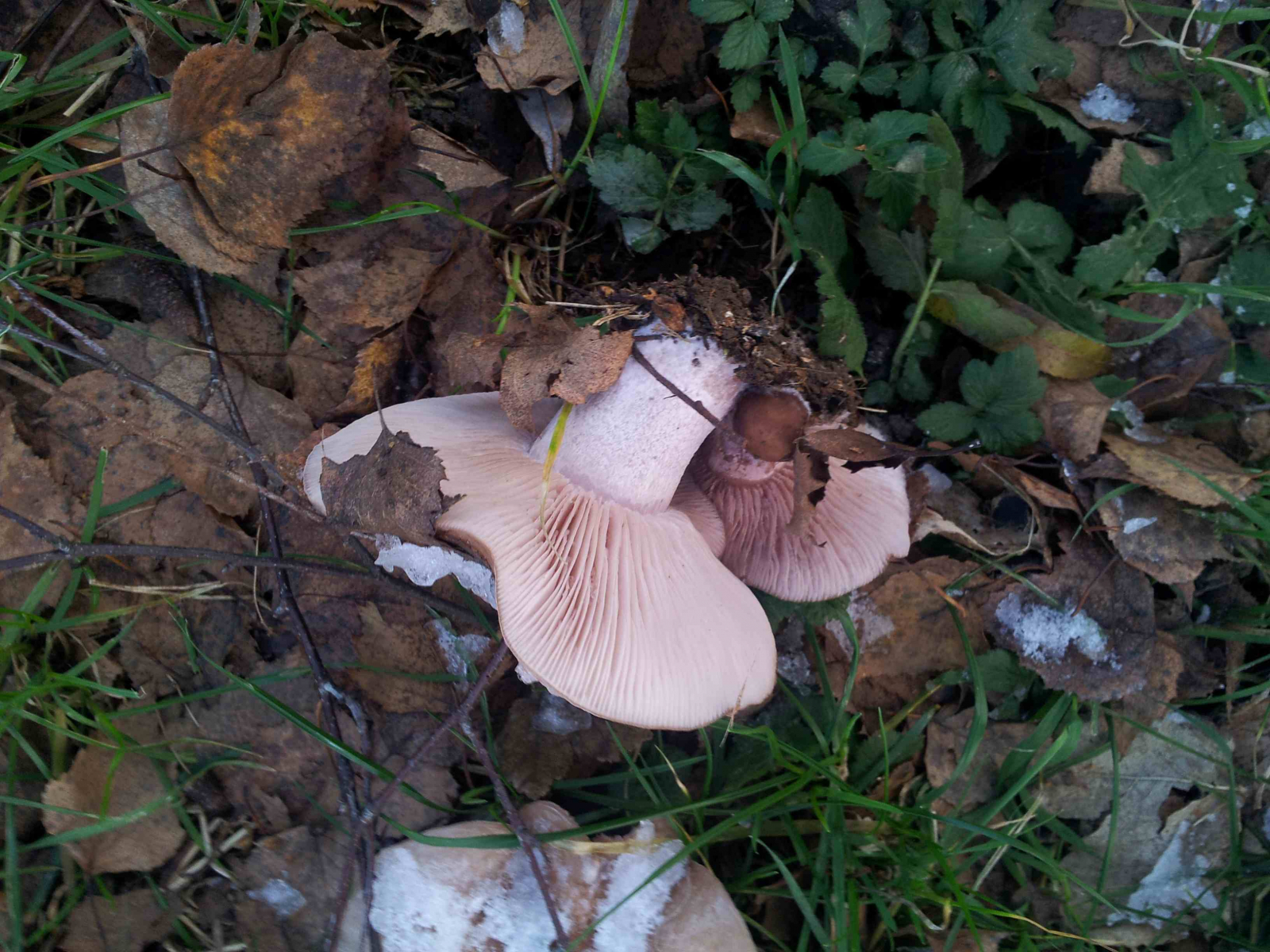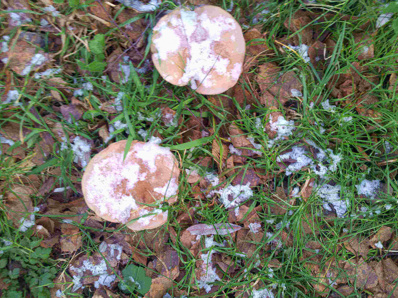 heute sah ich eine ganze Gruppe von diesen Pilzen (siehe Anhang). Ich hoffe, dass der Schnee auf der Oberseite nicht zu sehr stört. Die pilze stehen immer zu zweit oder dritt zusammen, sind aber unter dem Baum mit Anstand von 20 - 30 cm verteilt. Der Hut ist braun und beige mit Durchmesser zwischen 8 bis 16 cm. Der Stiel ist weiß und wird nach unten hin etwas stärker, dort hat er Durchmesser von ca. 3 bis 5 cm. Die Lamellen sind weiß mit leicht rosa Schatten.Kann da jemand was Verlässliches zu sagen? Danke.