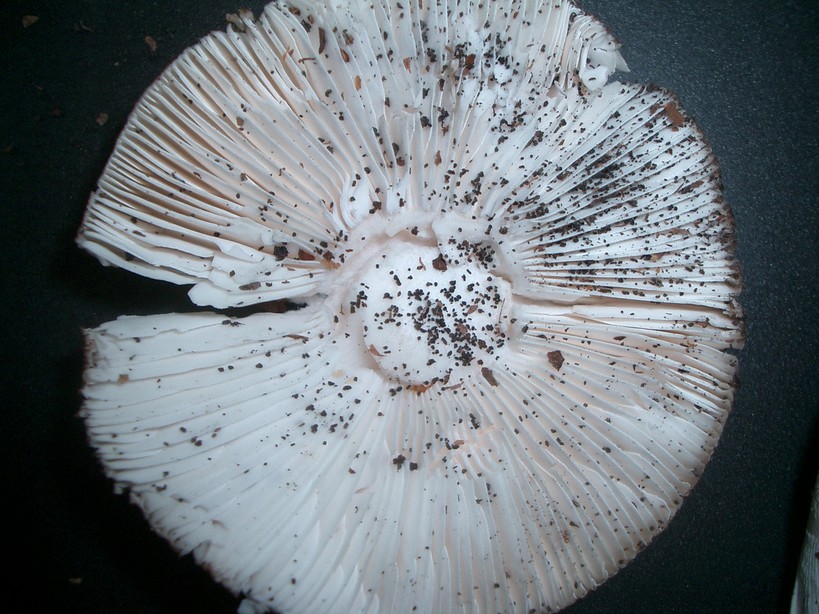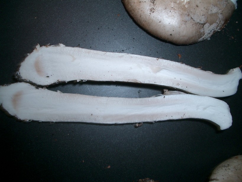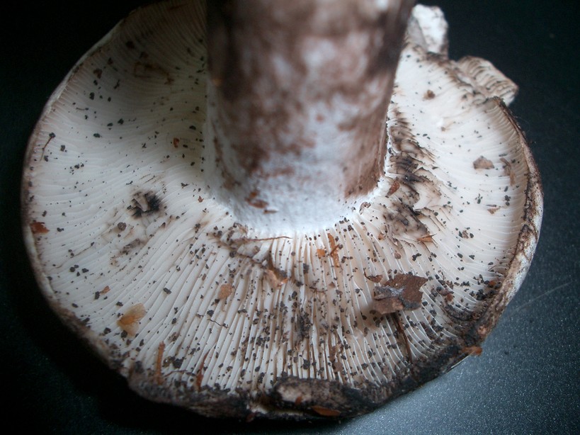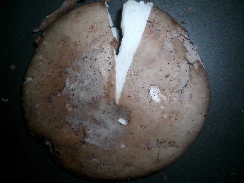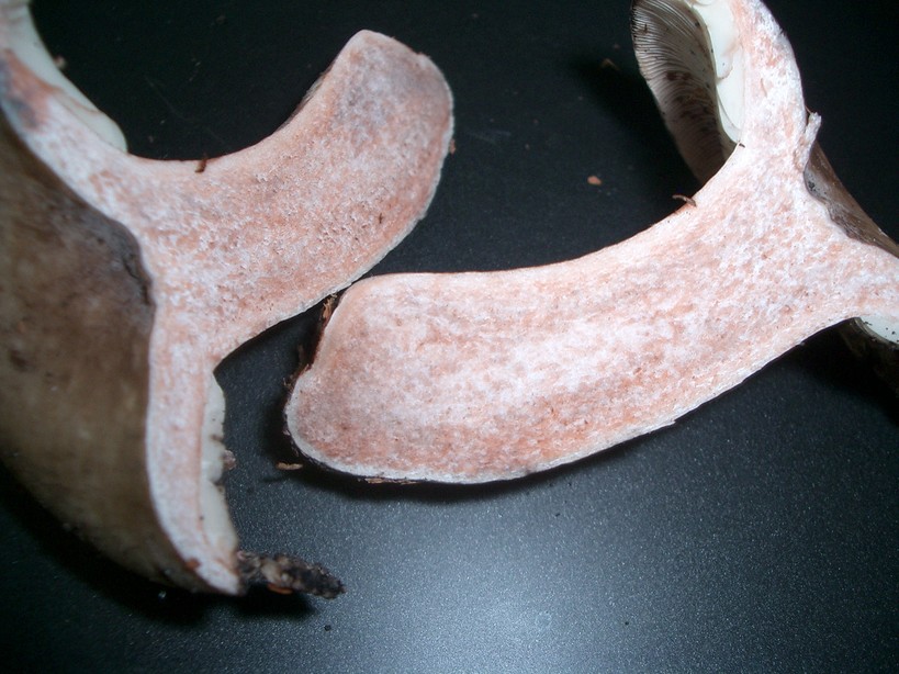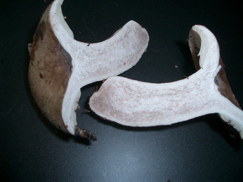 Der zweite hat einen Hutdurchmesser von ca. 8 cm. Der Hut war vorher halbkugelig und die Lamellen waren sehr Hell, fast weiß, haben sich aber später bräunlich verfärbt und sind nach ca. 30h nun richtig Schokoladenbraun wie bei Champignons. Das Sporenpulver ist ebenfalls braun. Ich meine auch einen leichten Anisgeruch wahrgenomme zu haben, diese kann aber täuschen. Könnte es Agaricus silvaticus sein?: