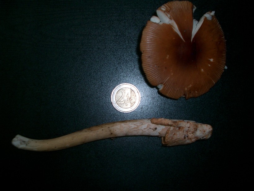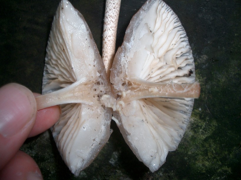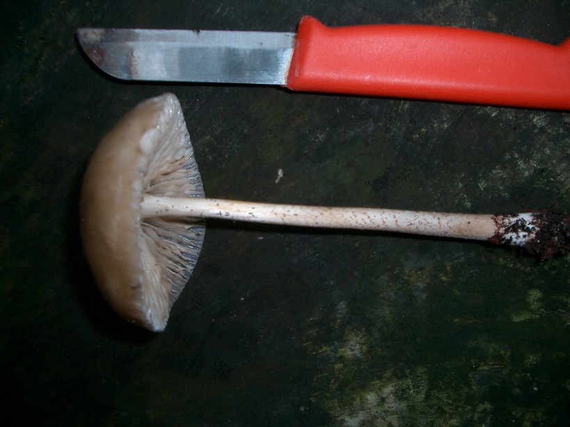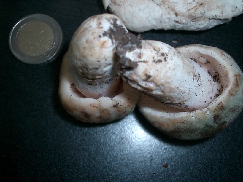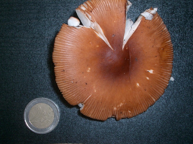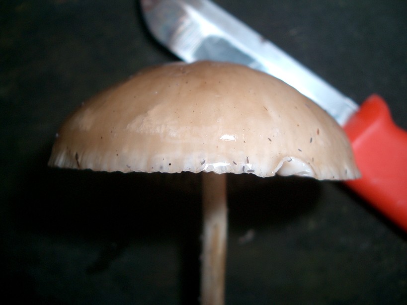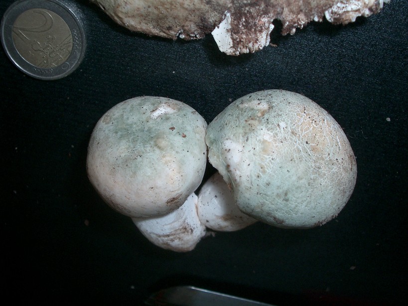 Der zweite hat einen Hutdurchmesser von ca. 8 cm. Der Hut war vorher halbkugelig und die Lamellen waren sehr Hell, fast weiß, haben sich aber später bräunlich verfärbt und sind nach ca. 30h nun richtig Schokoladenbraun wie bei Champignons. Das Sporenpulver ist ebenfalls braun. Ich meine auch einen leichten Anisgeruch wahrgenomme zu haben, diese kann aber täuschen. Könnte es Agaricus silvaticus sein?: