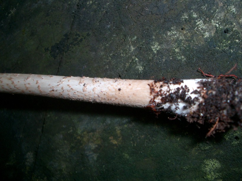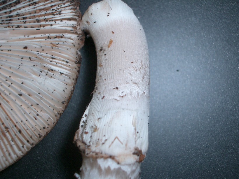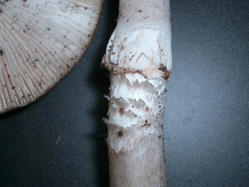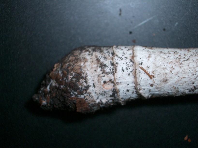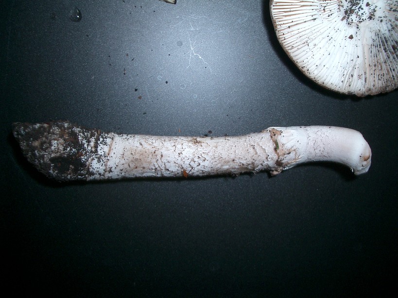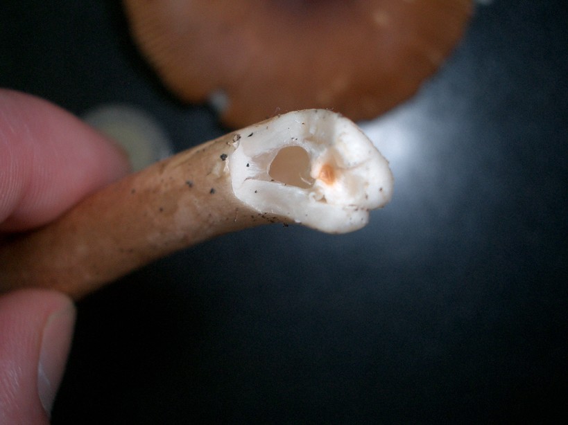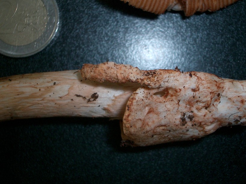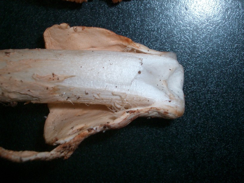 Der Stiel hat keinen Ring, ist hohl, oben glatt unten etwas fransiger bis genattert. Die Farbe würde ich als hellbraun-rötlich oder hautfarben bezeichnen. An der Basis befindet sich eine sackartige Volva.