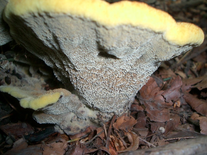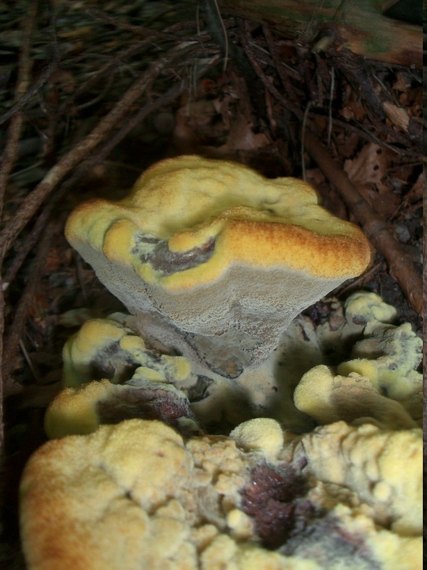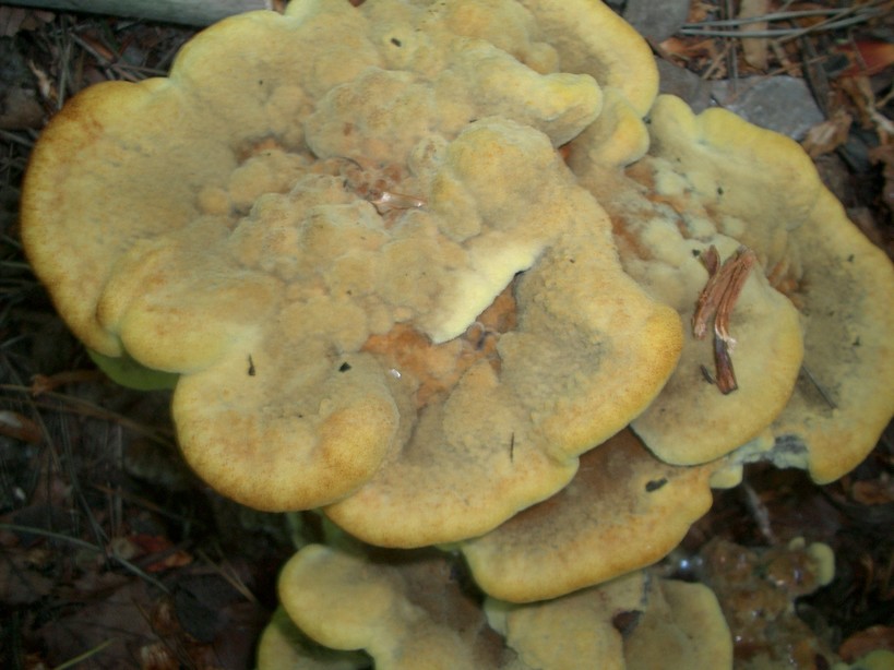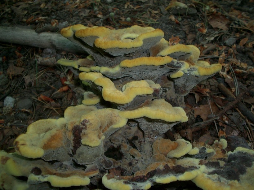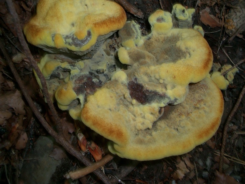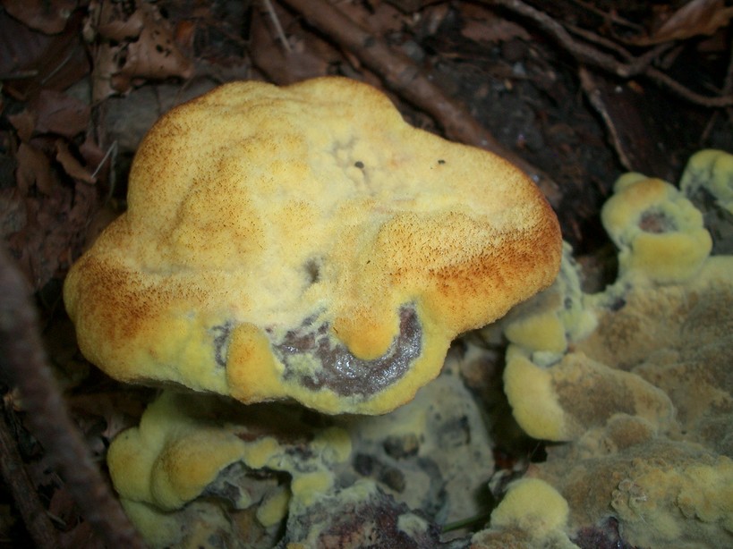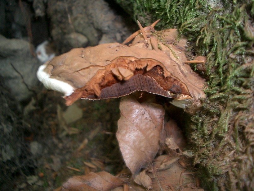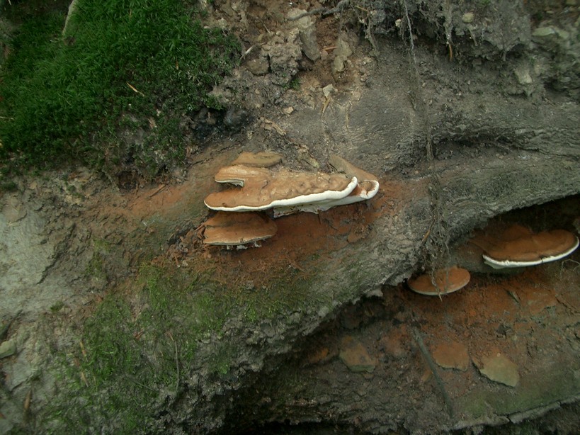 Das Fleisch des nächsten Pilzes war trotz trockenem Wetter nicht nur Feucht sondern sogar richtig Nass. Wie ein vollgesogener Schwamm. Vielleicht Phaeolus schweinitzii: