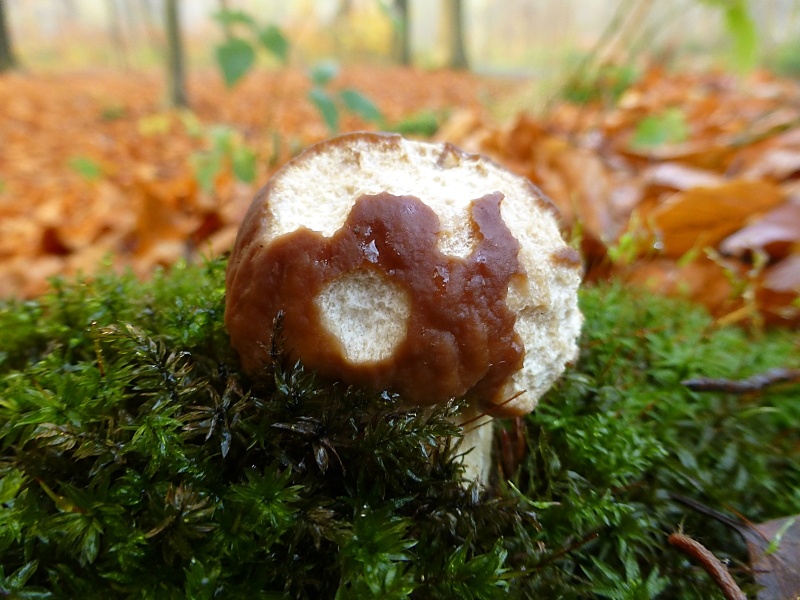 Hut: Hutdurchmesser ca. 10 cm, Huthaut mittelbraun, samtig, kleinfelderig aufgerissen, Fraßstellen z.T. rötlich, sonst heller braun als die Huthaut, Hutfleisch durch Schnitt kaum blauend