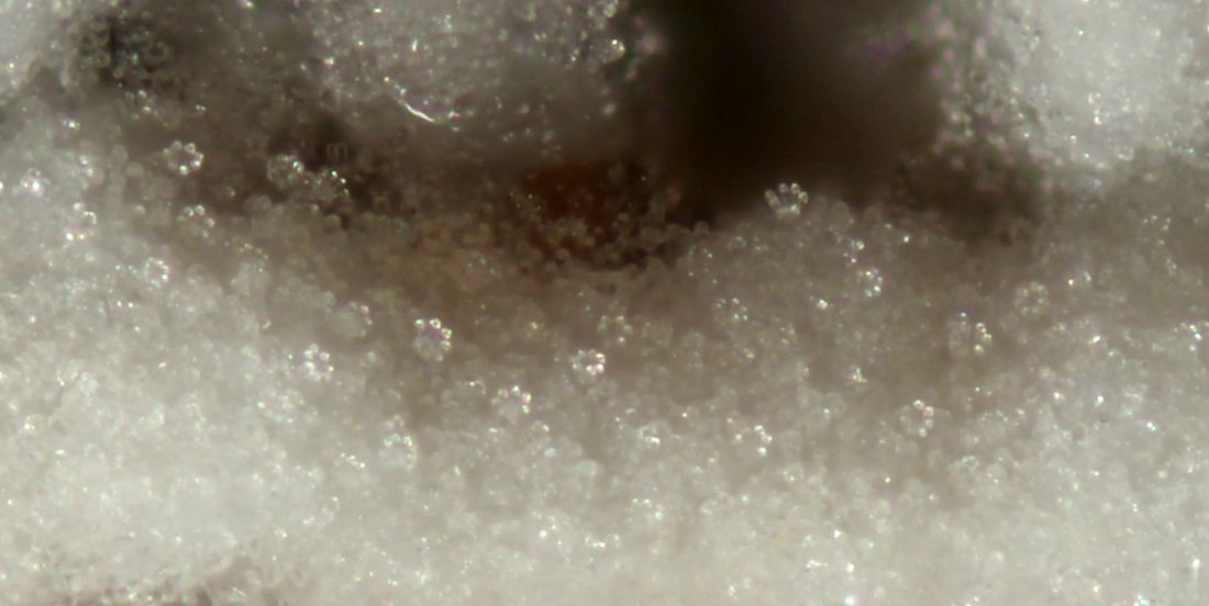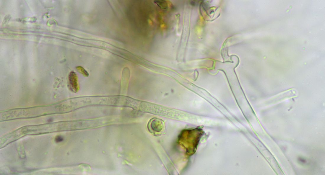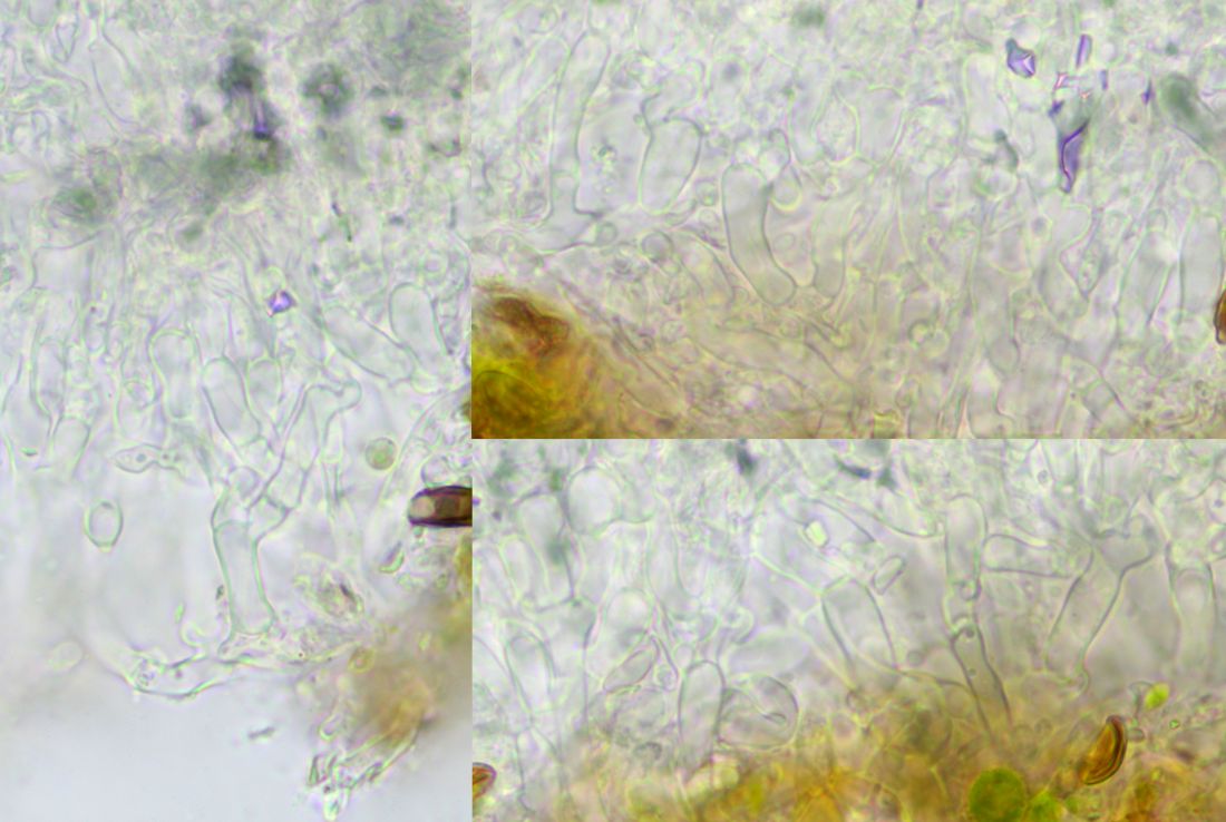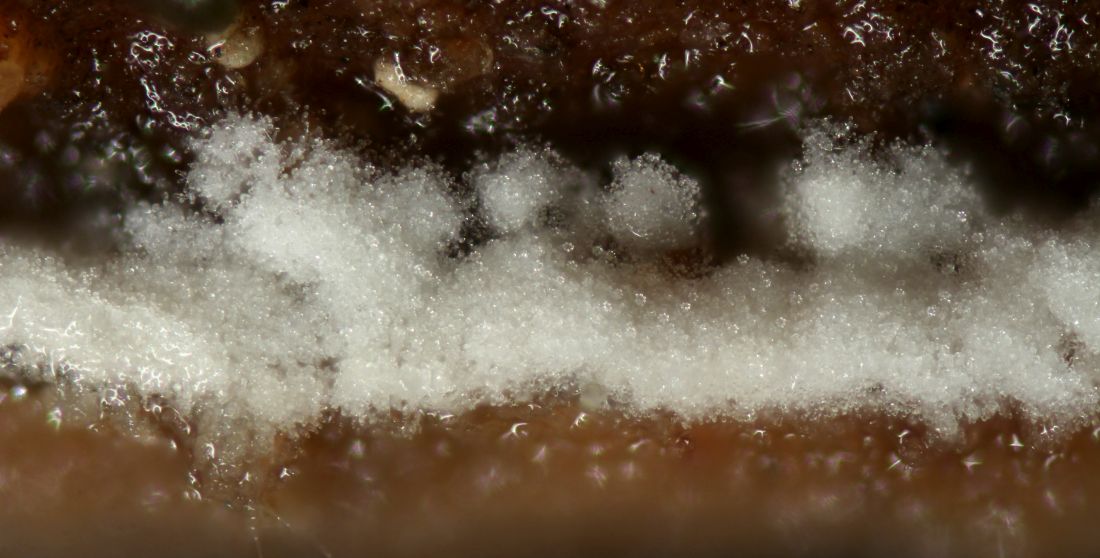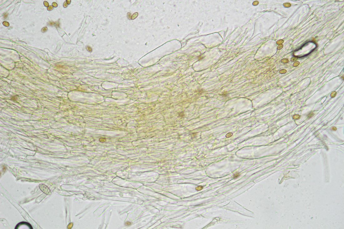 Die Unterseite ist weiß, bis zur Mitte hab ich die allerdings nicht entnommen. Beim Trocknen wird der hintere Bereich der Unterseite deutlich dunkel. Rhizinen besonders im apikalen Bereich aufgefächert, nach unten eher glatt (siehe Bilder).