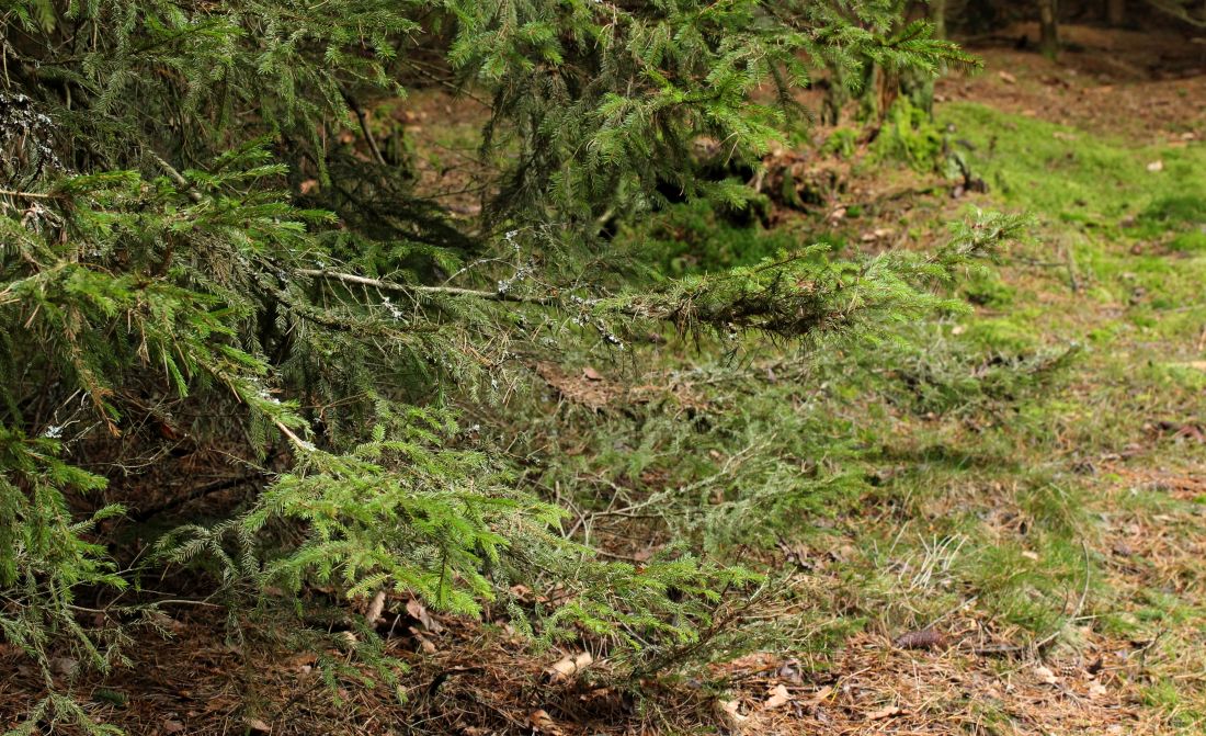 Dazu muss man am lichtdurchfluteten Rand von meist dichten Fichtenbeständen suchen, die Nadeln sind hier manchmal etwas weißlich bereift. Das ist meist kein Dreck, sondern gehört zu einer Flechte, hier Fellhanera bouteillei: