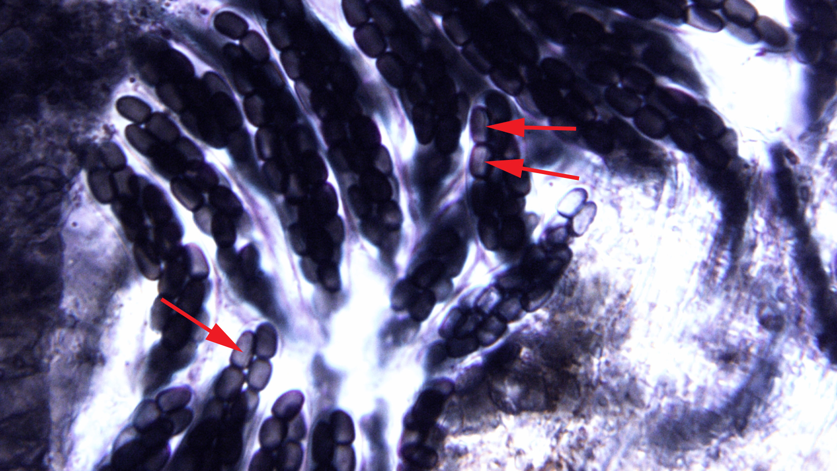 Nun müsste man bei candidolanata unterschiedlich geformtes Velum finden, also große längliche Zellen in Ketten und eben die kleinen verzweigten Elemente, die auch oben schon zu sehen sind. Bei letzteren gibt es keinen Zweifel, die großen Elemente sind oft schwer von der HDS zu unterscheiden und bei der Winzigkeit der Fruchtkörper ist es recht schwer, das Velum separat zu bekommen. Werde mal noch versuchen das im Auflicht bei 100-fach zu bekommen, da ist die Struktur klarer als im Quetschpräparat.