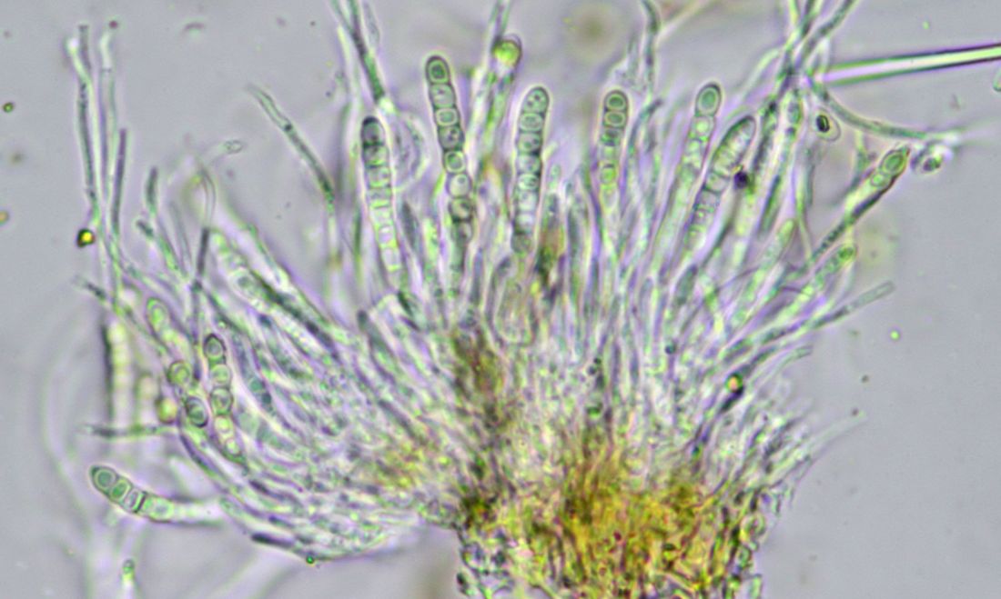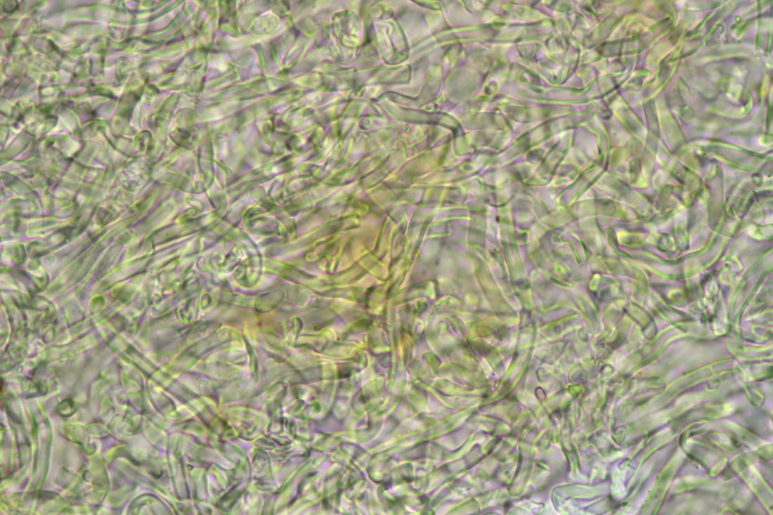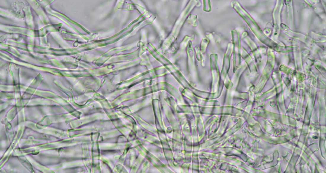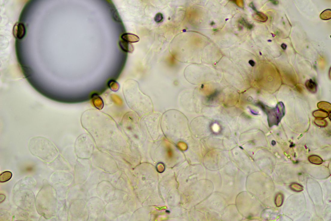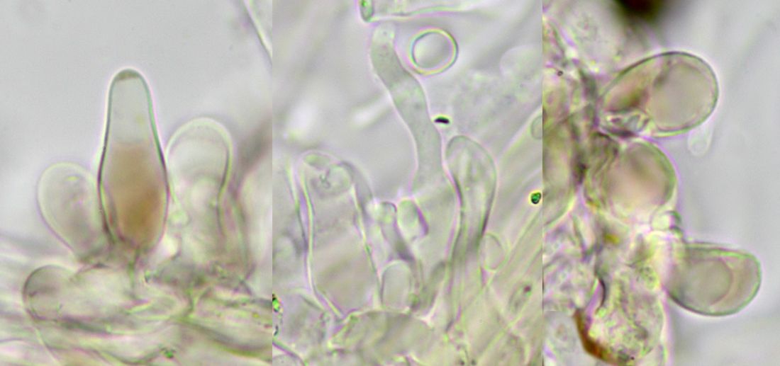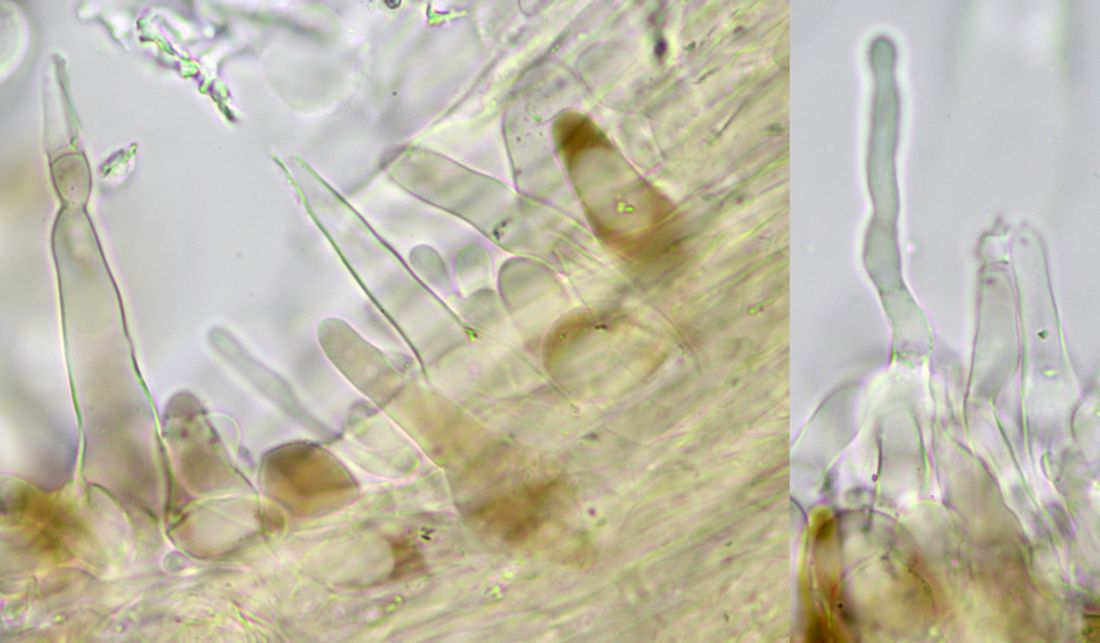 Die Pleurozystiden sind zahlreich vorhanden und wirklich 1:1 identisch mit den Cheilos, es fehlen nur die kleinen keuligen Elemente der Schneide dazwischen (die Gruppe links sind noch Cheilos, der Rest Pleuros):