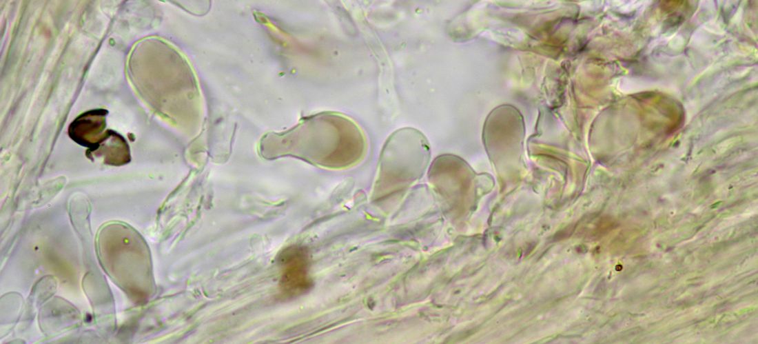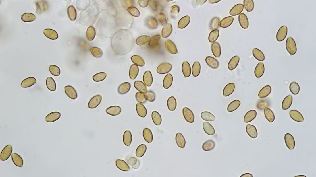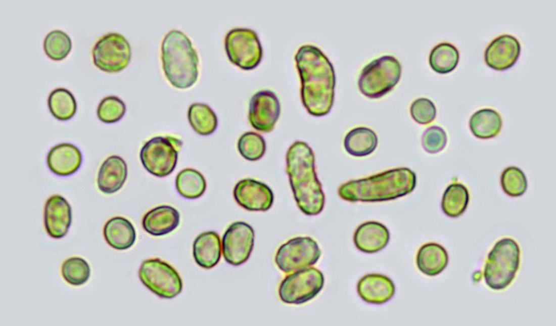 Die Sporen sind spannend, (N=45) (5.6) 6.0 - 7.6 (8.0) × (4.0) 4.1 - 4.5 (4.6) µm groß, braun und haben einen Farbübergang, oben heller als unten.
