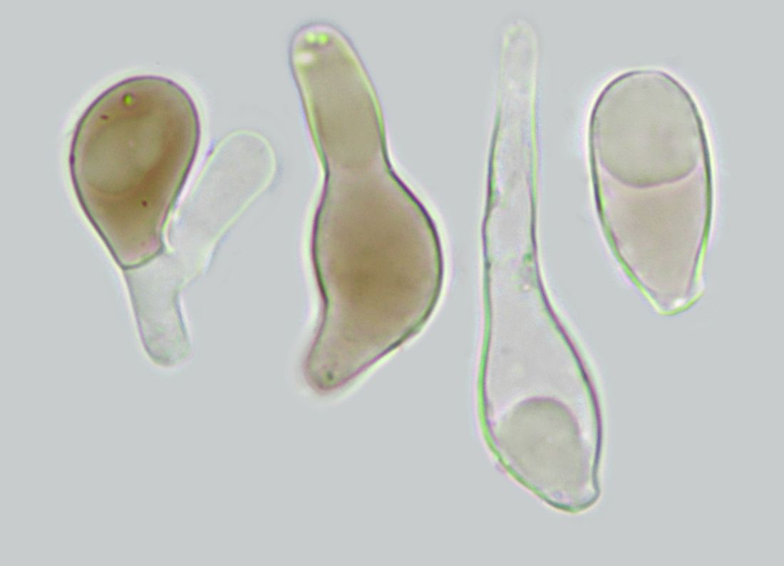 Die Cheilozystiden sind verstreut oder in kleineren Gruppen wachsend, oft untermischt mit kleineren, keuligen Elementen, (41.9) 46.7 - 65.3 (80.3) × (8.8) 9.9 - 16.2 (17.6) µm: