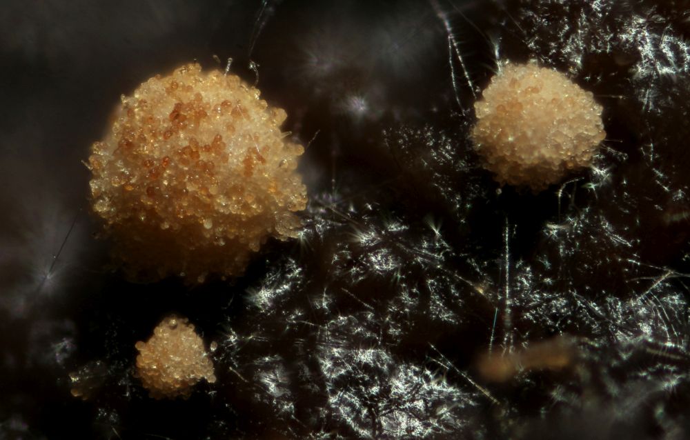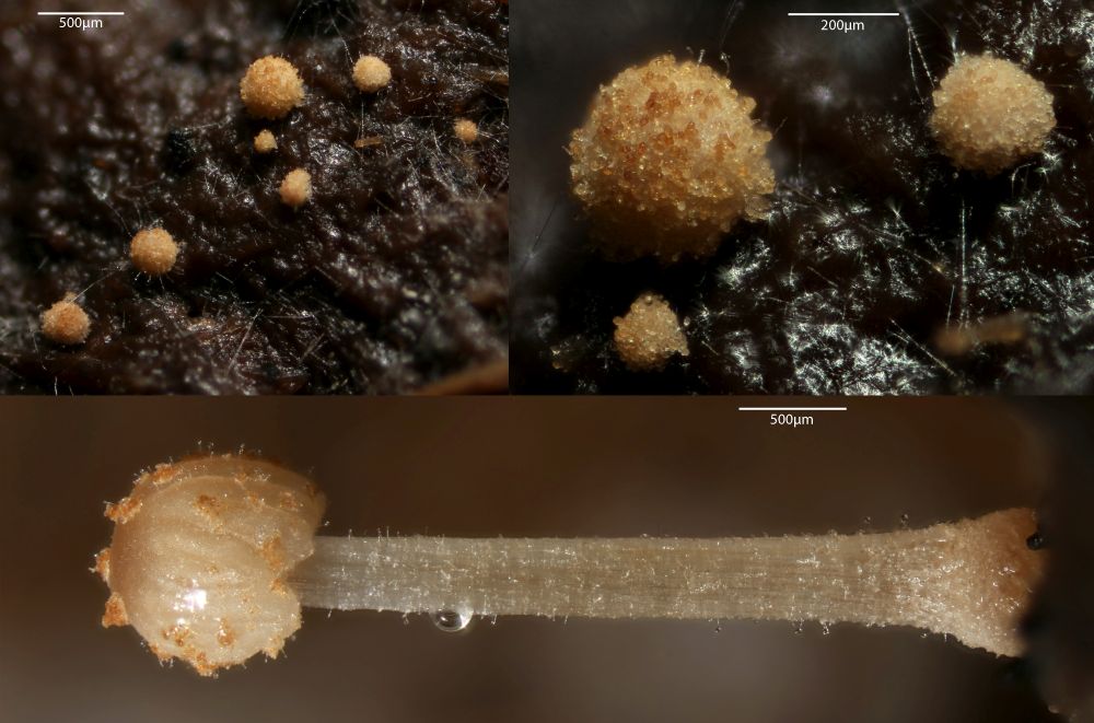 Es handelt sich um einen winziges Becherchen von ca. 0,15 mm Durchmesser. Das Substrat, ein Maus-Köttelchen misst auch nur ca. 3 x 1 mm. Da ist es schon nicht ganz einfach diesen Winzling sauber herunterzubekommen und dann zu präparieren. Klappt trotzdem jedes Mal wieder irgendwie.