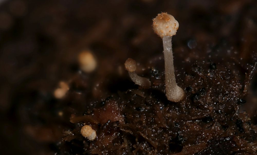 Dann wachsen die Kerle etwas und es bildet sich ein Stiel unter den Knubbeln, der das vorher gezeigte als Hut nach oben schiebt und das Velum zu braunen Flecken auseinanderbrechen lässt: