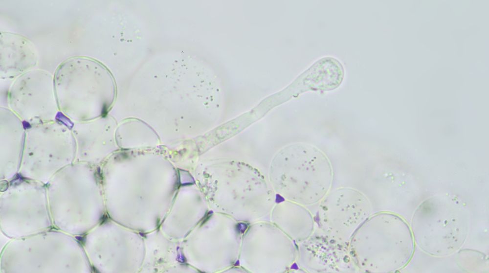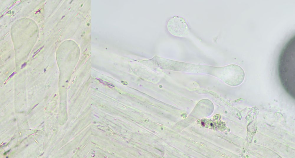 Etwas später bilden sich die Pileozystiden (Huthaare), die hier angeschwollen scheinen und mit Wassertröpfchen am Ende: