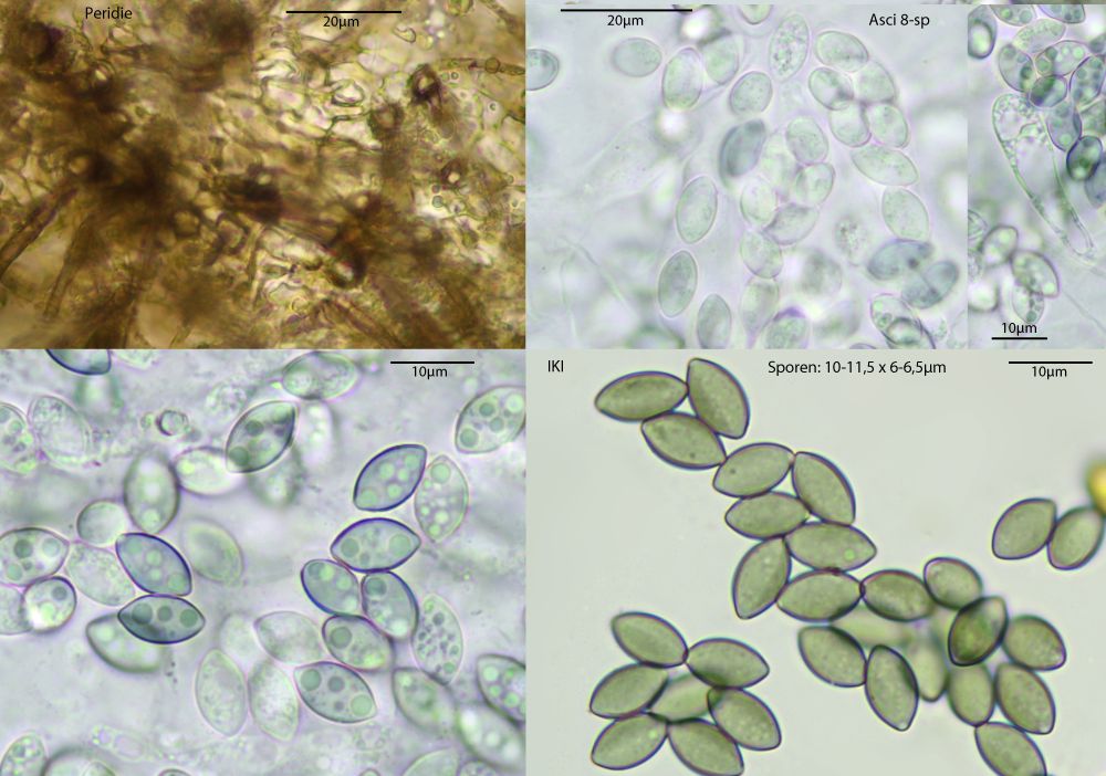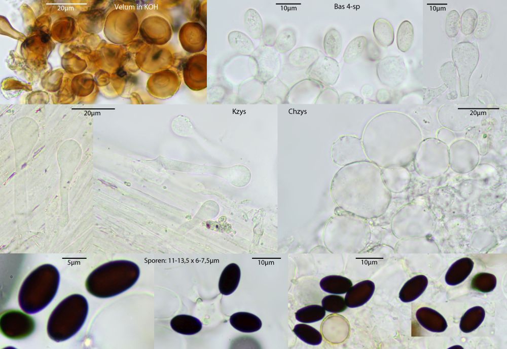 Die Art wurde mir ja schon mal vor langer Zeit geschickt, war da aber nur in schlechtem Zustand angekommen. Übereinstimmend mit allen Funden, die ich bislang kenne, sind die Sporen etwas länger und deutlich breiter als bei Van Brummelen angegeben.