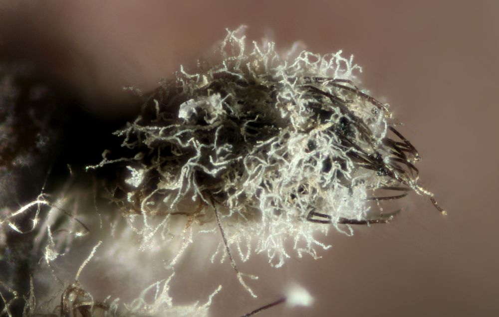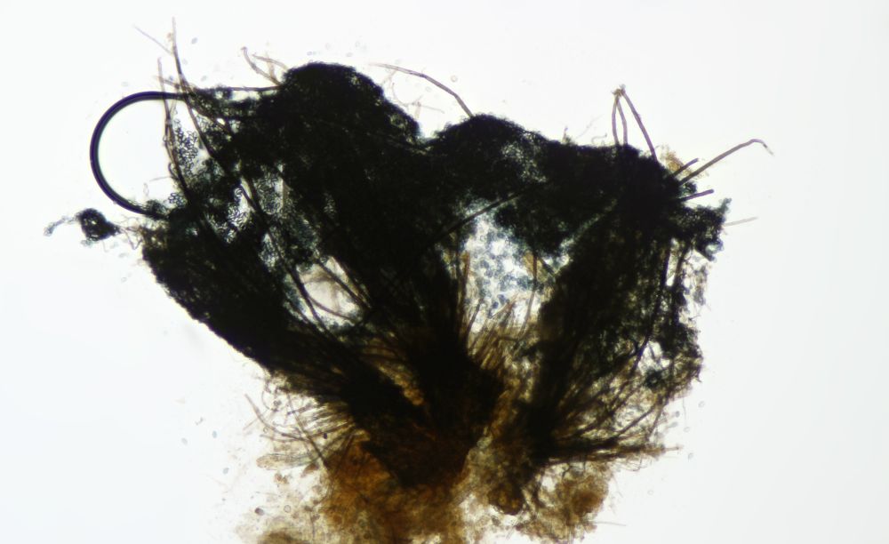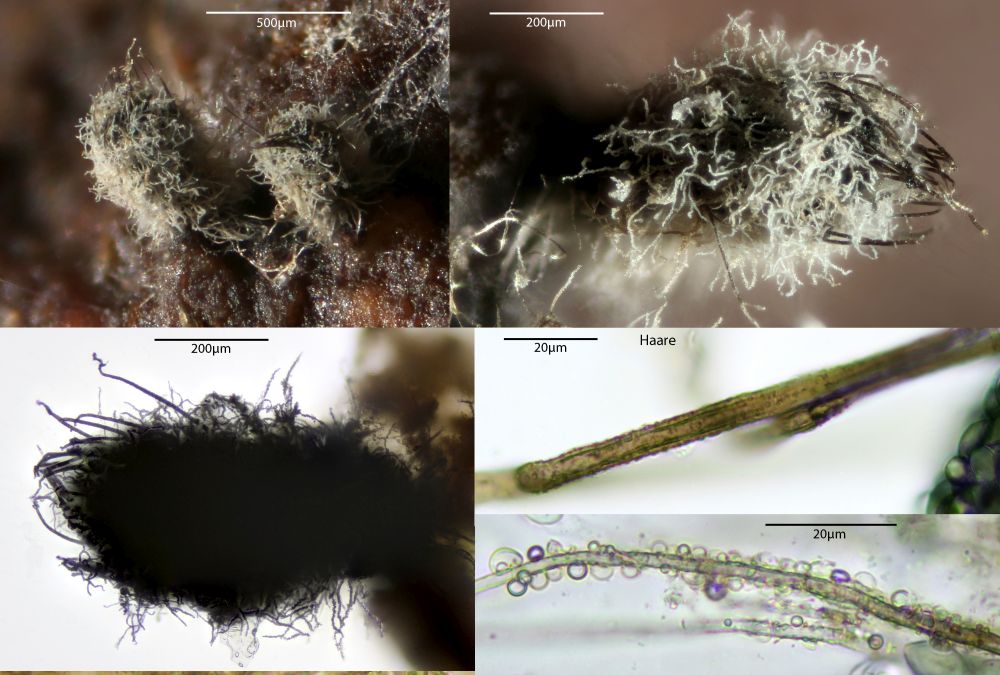 Chaetomium cuniculorum ist mein Ergebnis für diese kleinen Wollbüschelchen mit zwei verschiedenen Haartypen und ziemlich langen Sporen.