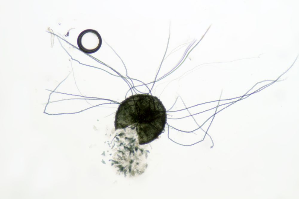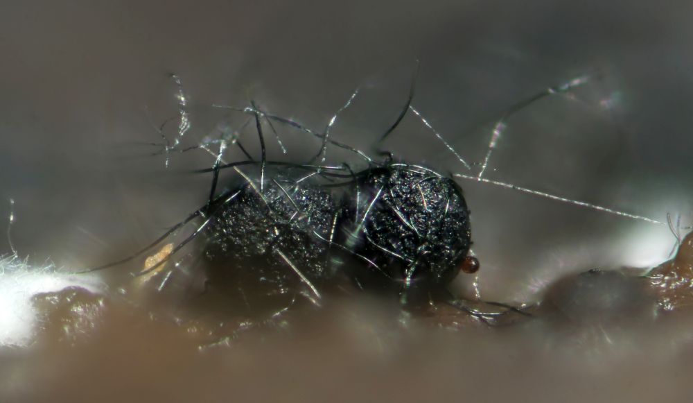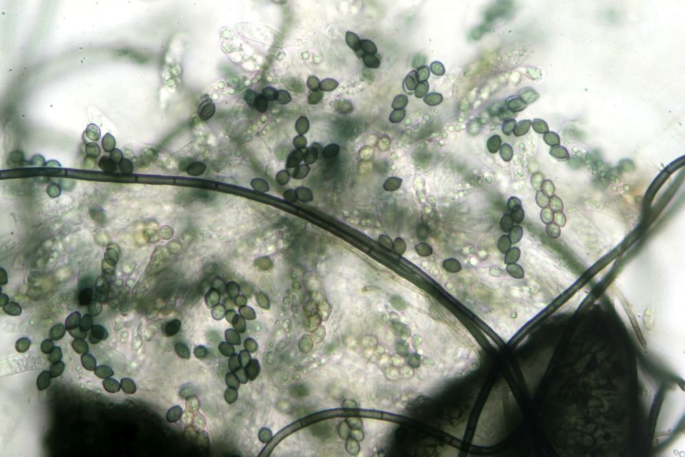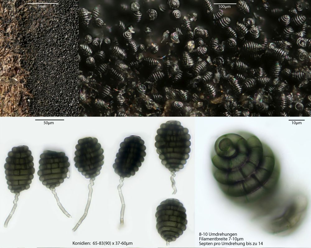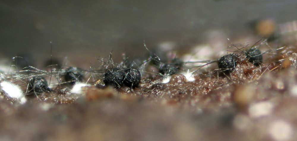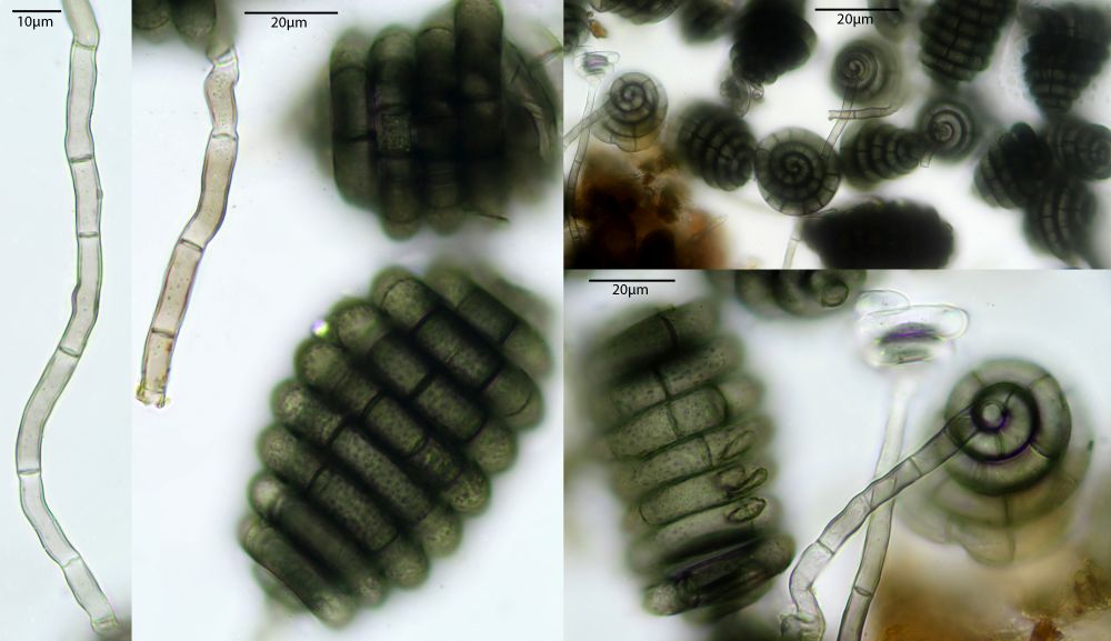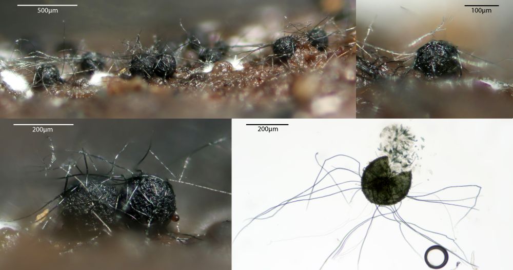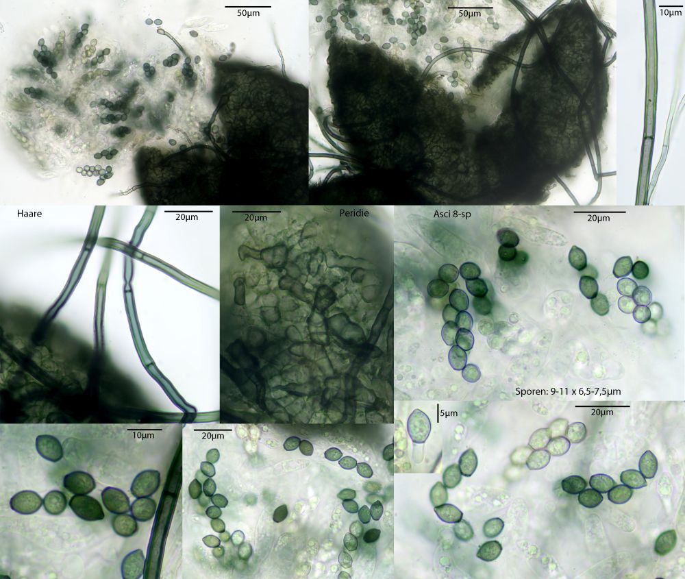 Vorgenommen hab ich mir zunächst die vom Transport unbehelligten schwarzen Pünktchen, die vorwiegend Sporormiella-Arten darstellen. Kernpilze habe ich auf den Proben 5 Arten festgestellt, davon 4 Sporormiellas, wobei da durchaus noch mehr drauf sein könnten, die wachsen sehr durcheinander. Die vorgestellten Exemplare sind jeweils immer solche, bei denen ich die Zugehörigkeit aller Strukturen inkl. Makrofotos sicherstellen kann.