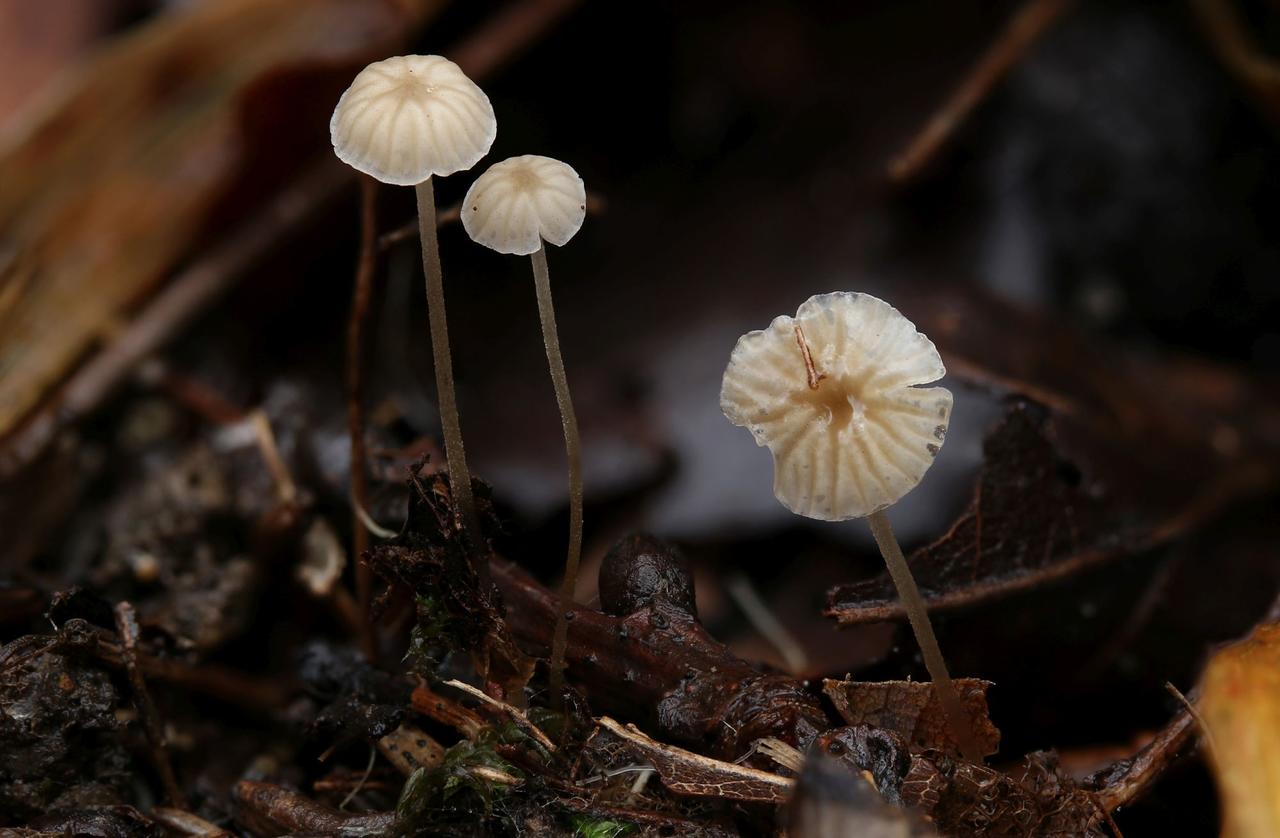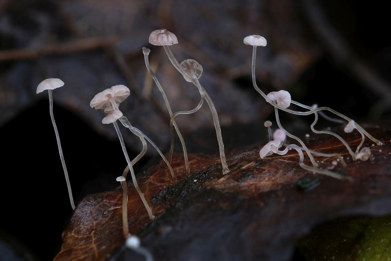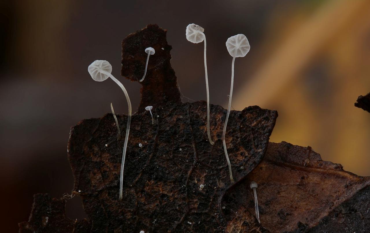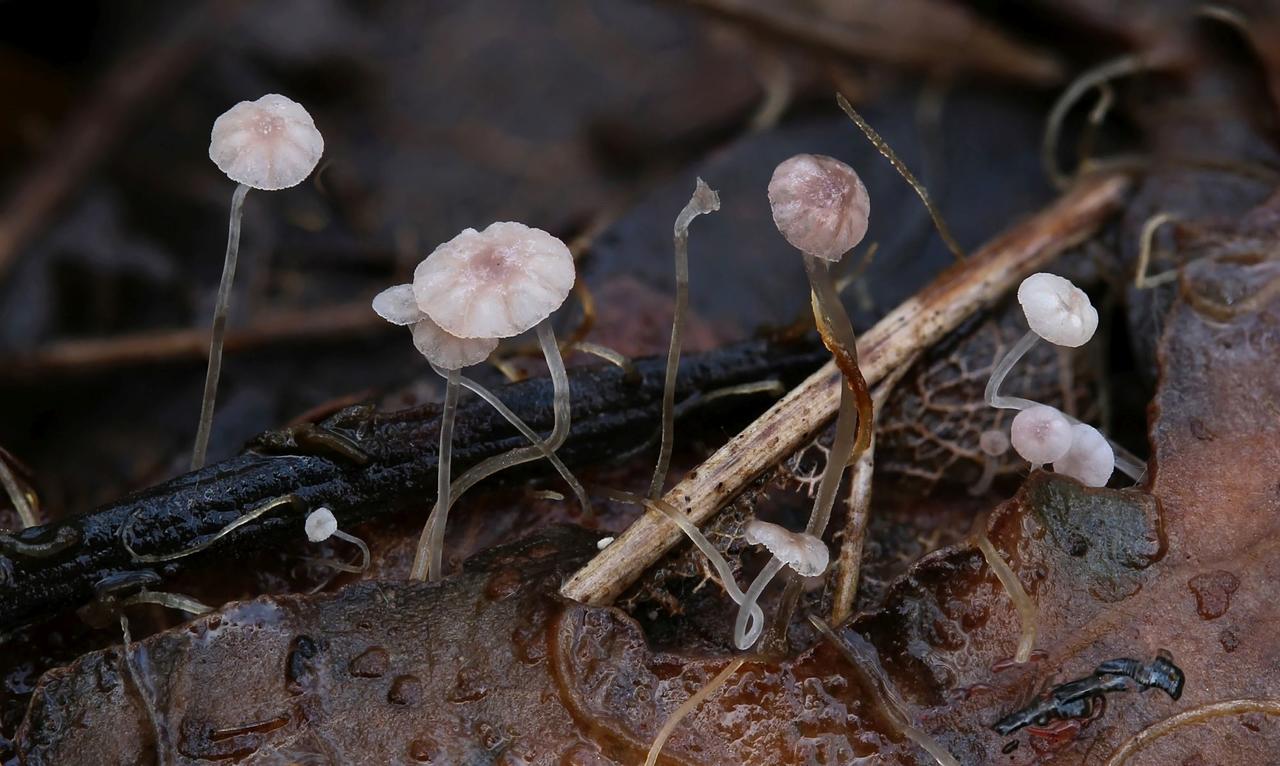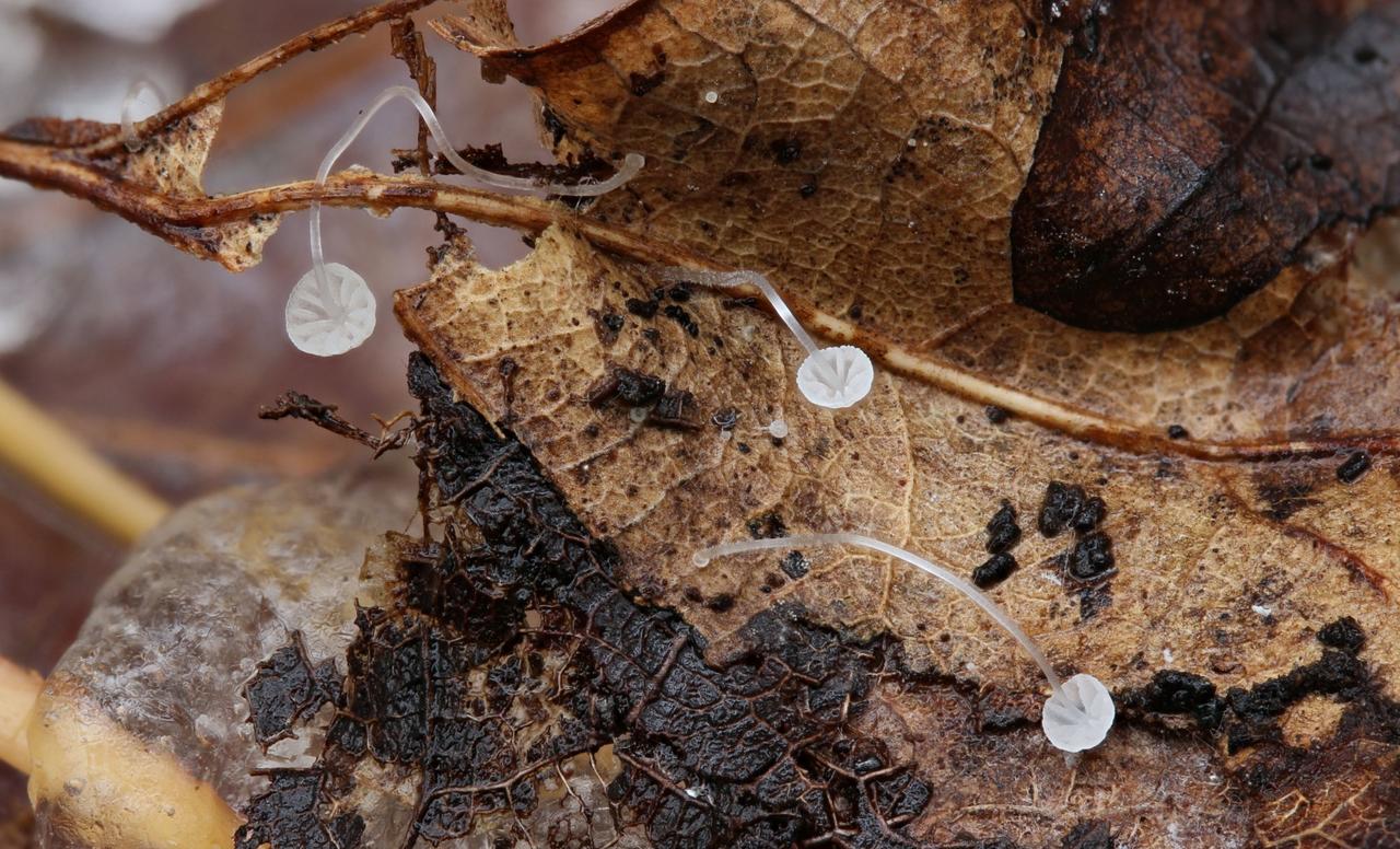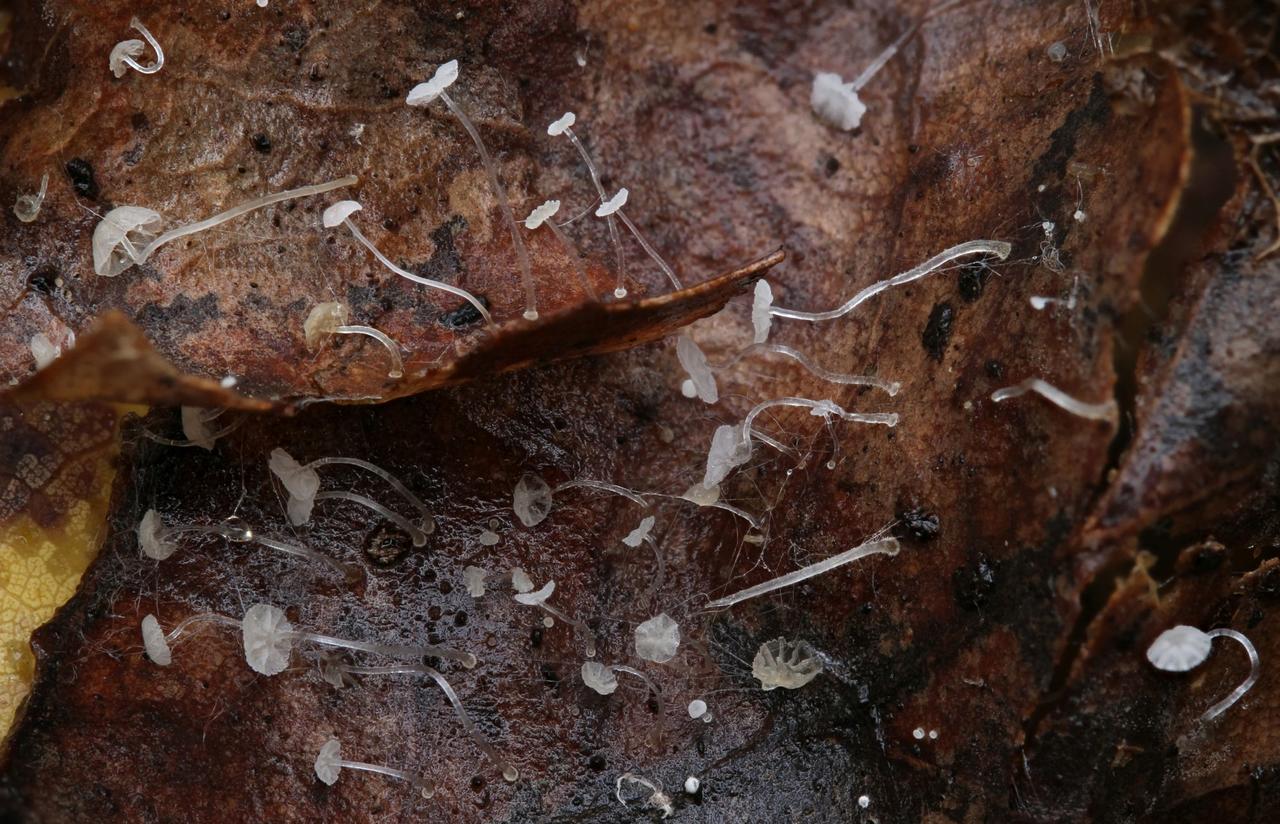 Man sieht, dass die Exemplare über eine kleine Basalscheibe an der Stielbasis verfügen, was die Bestimmung in Kombination mit dem Substrat Eichenlaub schon klar macht: Es ist Mycena mucor.