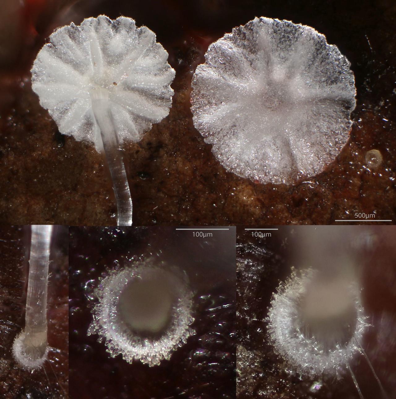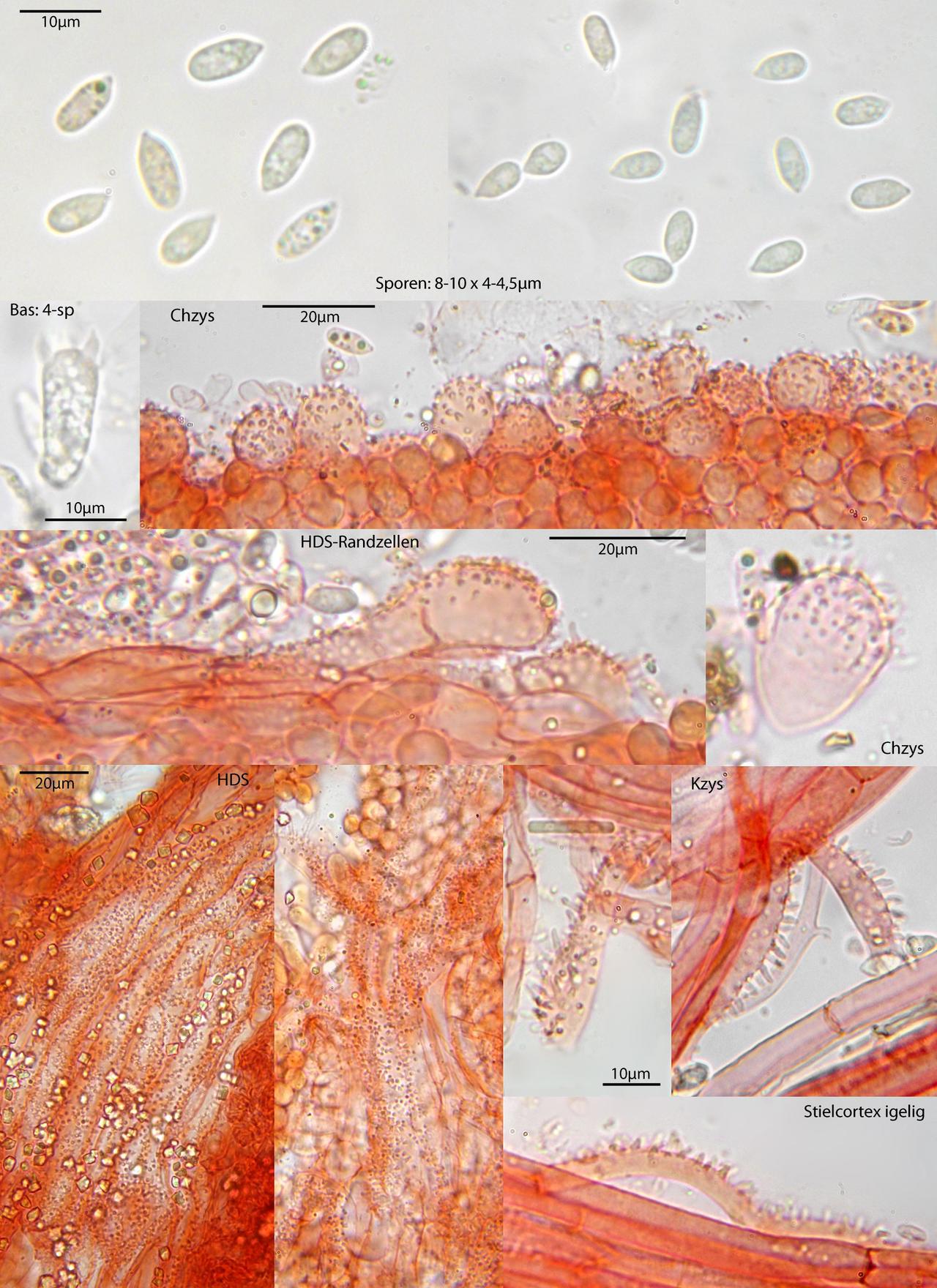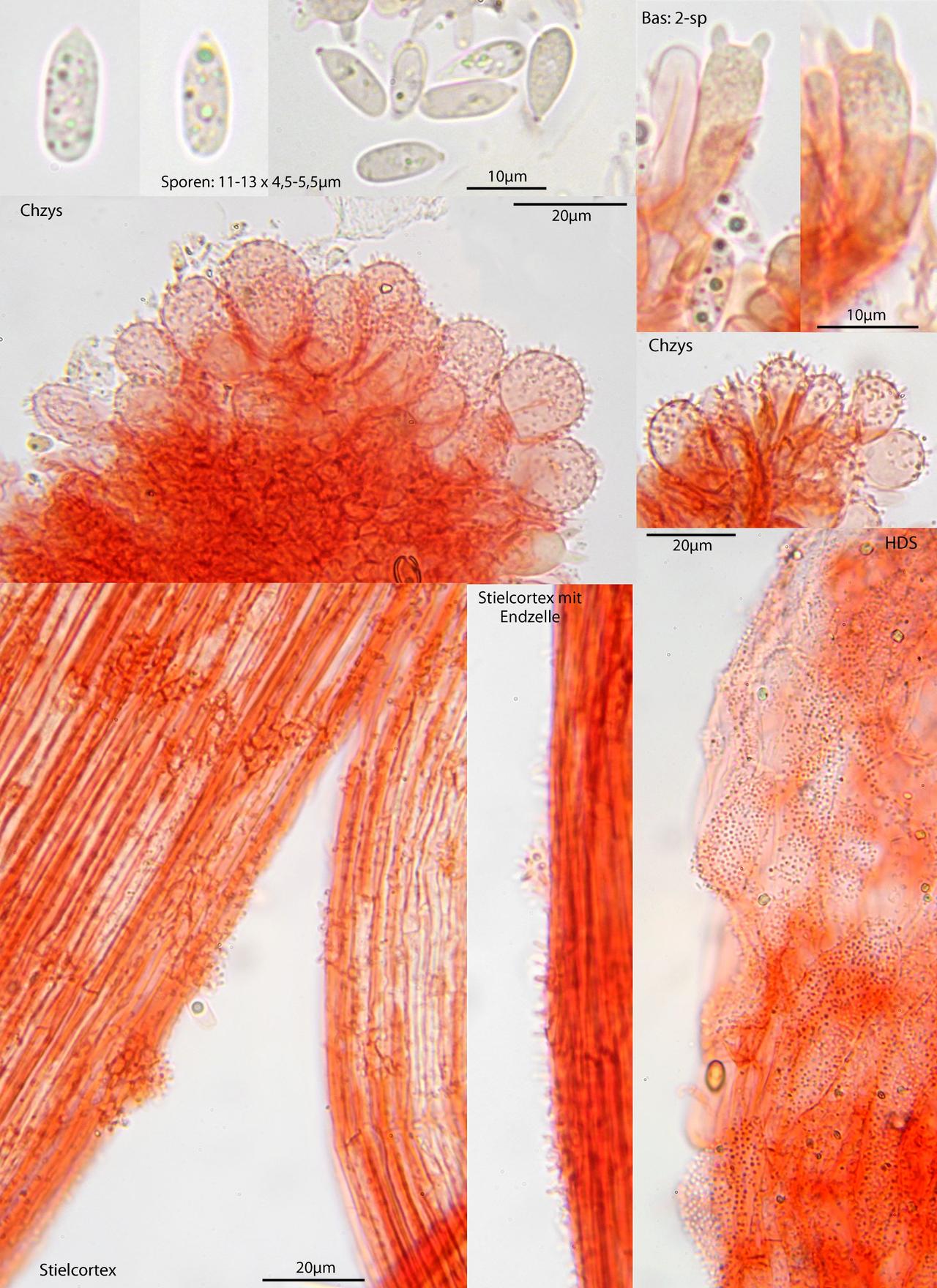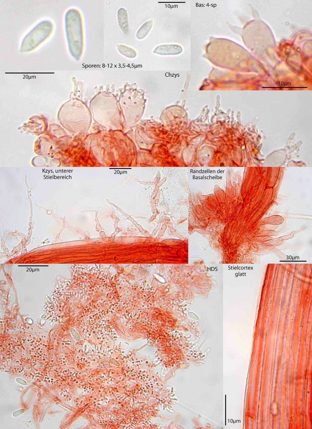 Wieder am gleichen Substrat, einige Meter weiter, einige Gruppen rosalicher Winzlinge. Genau die wollte ich finden. Mycena smithiana unterscheidet sich von den vorigen Arten makroskopisch durch die rosa Färbung und ist auch hier bereits eindeutig, so das Substrat denn Eichenblätter sind. Mikroskopisch von M. polyadelpha durch die größeren Sporen, die konstant 2-sporigen Basidien (was polyadelpha aber gelegentlich auch mal kann) und die anderen Stielrinden-Endzellen unterscheidbar.