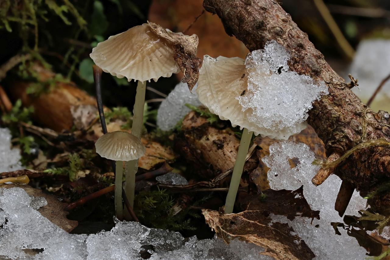 hier hat es seit einigen Tagen schon geschneit und gefroren. Die oberste Schicht des Waldbodens ist gefroren, was natürlich bedeutet, dass die meisten Pilze so aussehen wie diese Dehnbaren Helmlinge (Mycena epipterygia), die dank Frost alles andere als dehnbar waren: