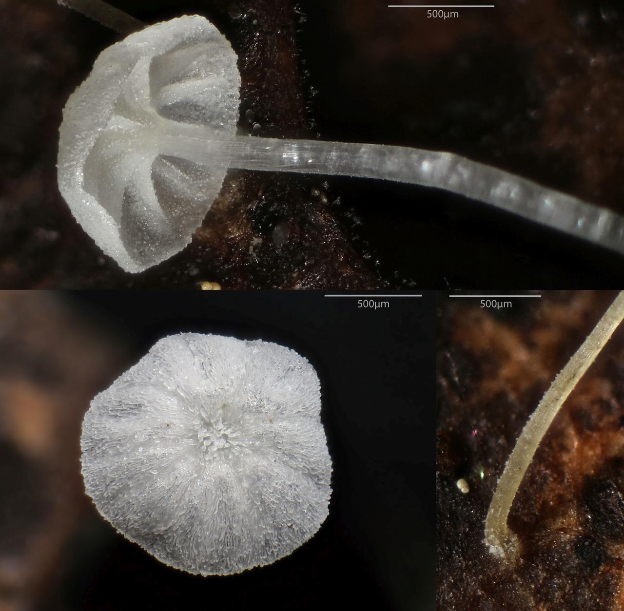 Kaum einen Meter weiter die nächste Art, die makroskopisch nicht über eine Basalscheibe verfügt und deren Lamellen den Hutrand nicht ganz erreichen. Wie Mycena mucor ist auch diese Art überwiegend weiß gefärbt, aber im Durchschnitt länger gestielt.