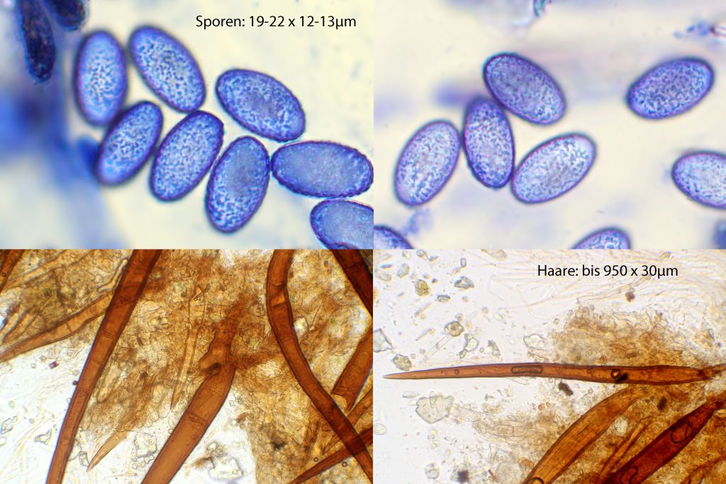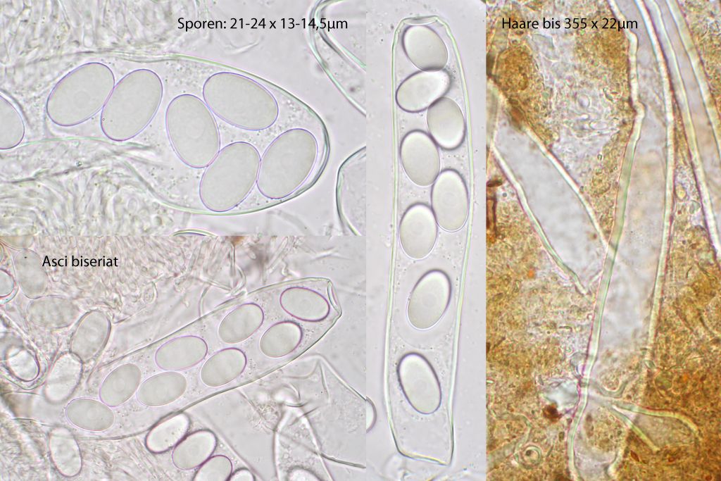 Ich denke es ist am ehesten Scutellinia vitreola, allerdings sind die Sporen recht groß und ich bin nicht sicher, ob die Ornamente nicht doch zu fein sind. Nehme ich im Schlüssel von Schumacher die Haare bis über 1000 µm an käme ich auf crinita, was noch viel weniger passt.