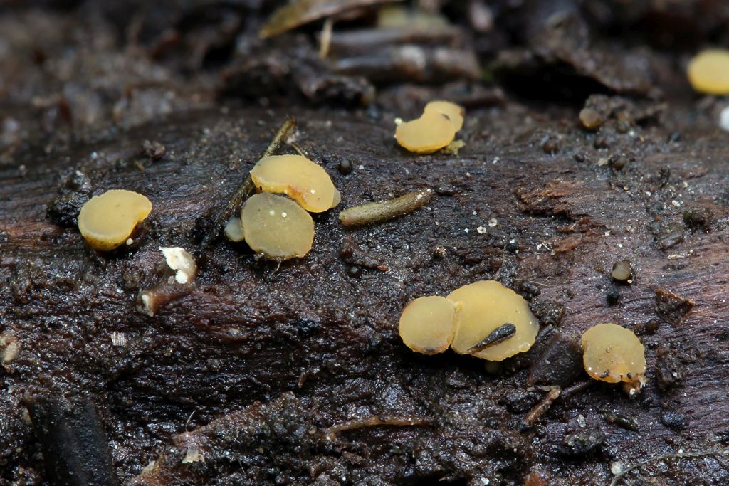 Daneben noch an einem sehr feuchten Ast - wohl Buche - einen kleinen gelblichen Becher, den ich aber mangels Kenntnis der inoperculaten Kleinen nicht sicher bestimmen kann. Vielleicht kommt da demnächst noch eine Anfrage dazu. Eventuell Hymenoscyphus sp: