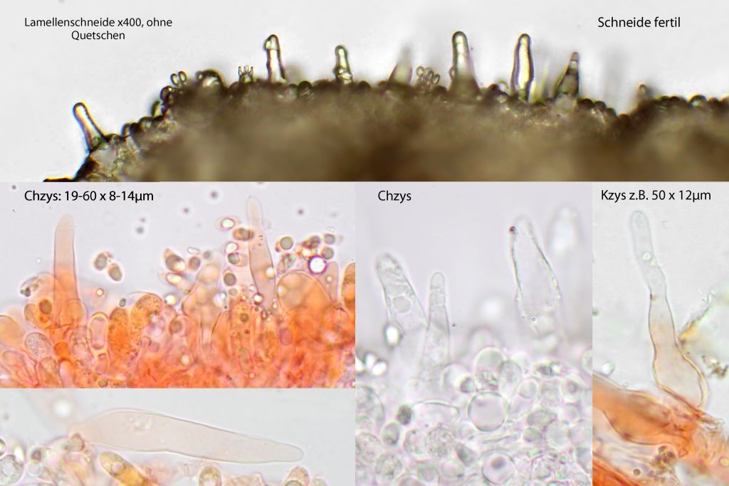 Lamellenschneide fertil, mit unregelmäßig verteilten Cheilozystiden: 19-60 x 8-14 µm. Kaulozystiden besonders im oberen Stielteil vorhanden: z.B. 50 x 12 µm, ähnlich Cheilozystiden.