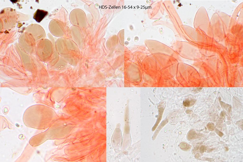 Sp. 6,5-8x3,5-4,5 qm. Cheilozyst. flaschenförmig, spindelig, lanzettlich, bis 55x15 qm; Pleurozyst. nicht festgestellt, Kaulozyst. ähnlich Cheilozyst., aber meist kleiner, gedrungener, oft auch aufgeblasen, ballonförmig usw., meist gehäuft, bis 50x15(17) qm. HDS-Elemente bis 100x35 qm (schlauchförmig).