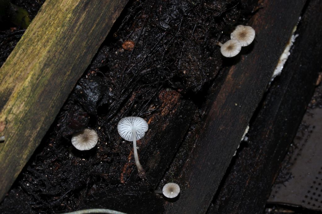 am Freitag, als ich mit Christian Gubitz wieder einmal die Gewächshäuser im ÖBG Bayreuth kontrolliert habe, hat uns ein Mitarbeiter, Herr Kastner, auf einen kleinen graulichen Pilz hingewiesen, der sich am Rand des Tropenwaldhauses versteckte. Zu finden waren 8 Exemplare davon.