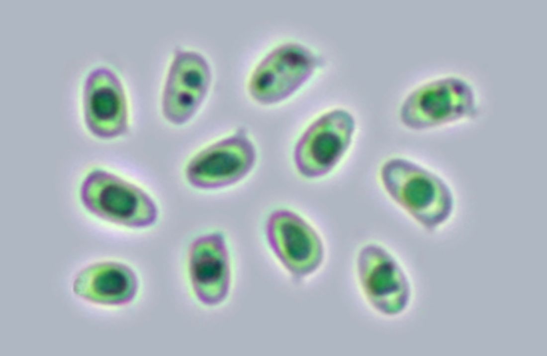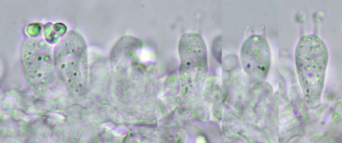 Die Cheilozystiden sind ohne solche Inhalte, darunter finden sich aber oft nahezu liegende Hyphen mit Inhalt: