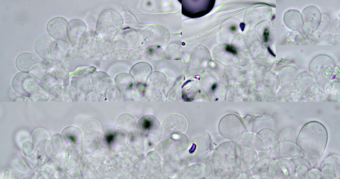 jetzt Lactocollybia: Ich wäre bei Lactocollybia cf cycadicola. Andere Arten haben anders geformte Pleurozystiden oder abweichende Sporen. Von Andreas' Fund gibt es aber auch Abweichungen, Sporen hier etwas kleiner (kann innerhalb der Variation liegen) und Pleuros nicht zerstreut, sondern schon regelmäßig häufig verteilt, aber sonst kommts nach der Beschreibung hin.