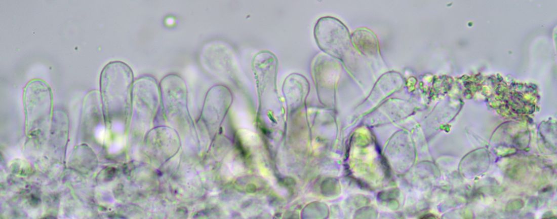 Der Fund hier hat meist sackförmige Pleuro-Gloeozystiden, hier links in Wasser rechts in KOH, man sieht deutlich, warum KOH hier nicht gut ist: