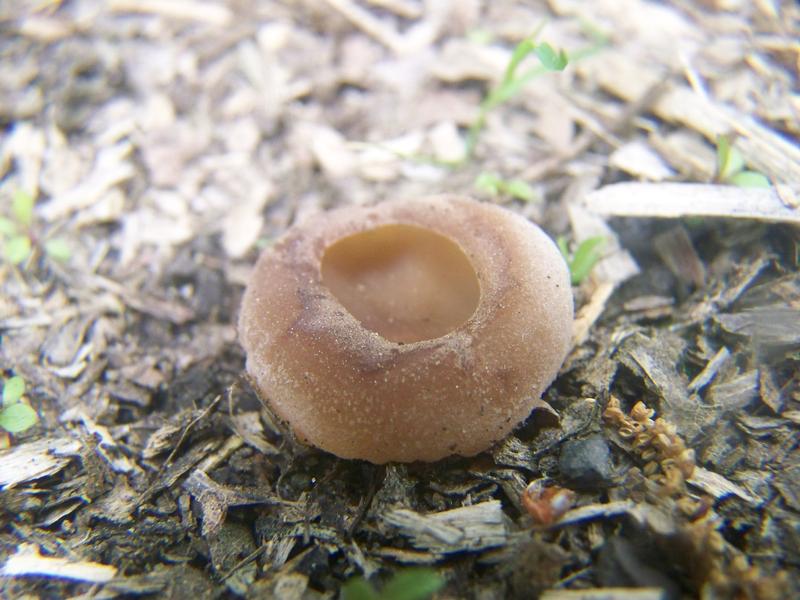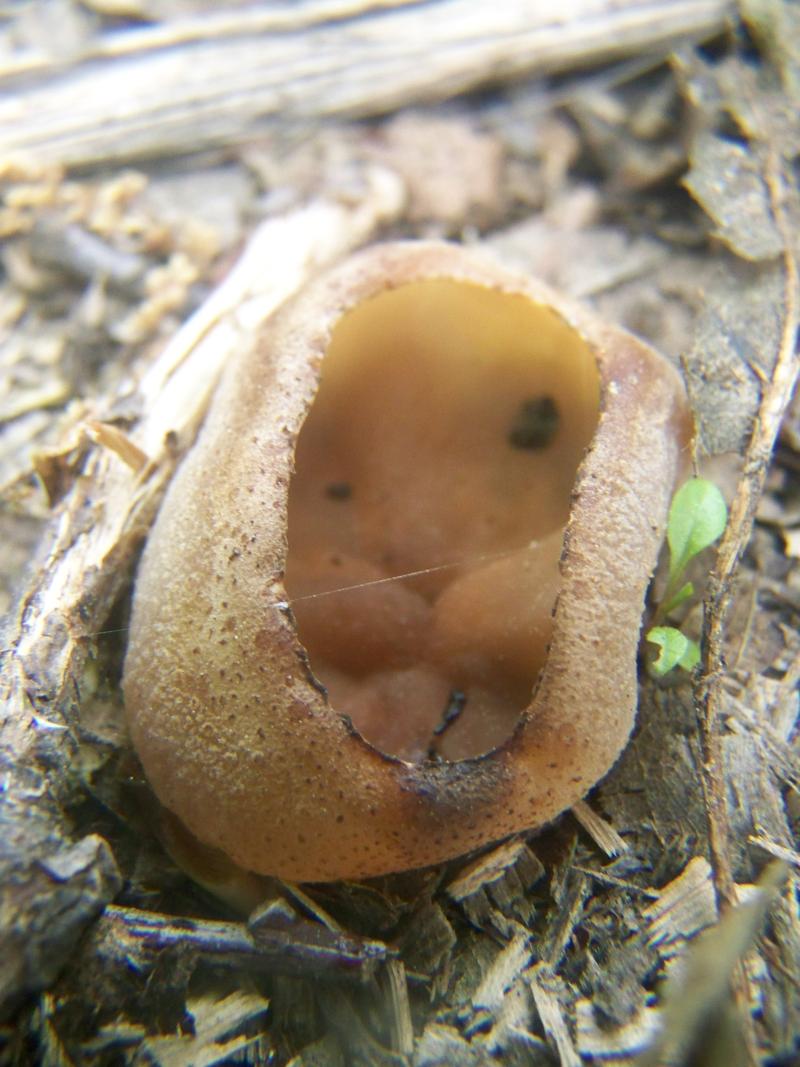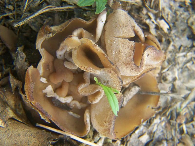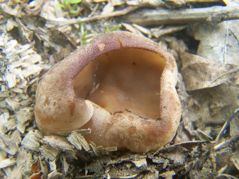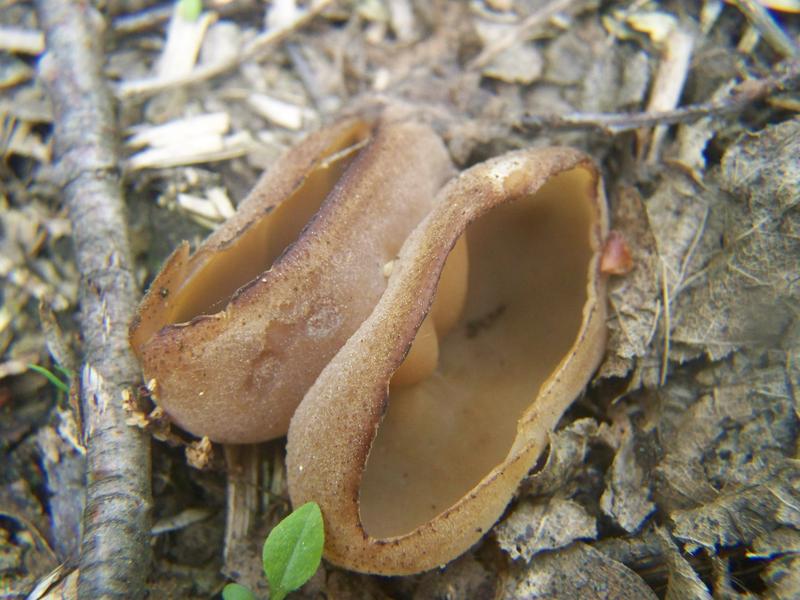 Nachdem unsere Tour eigentlich schon beendet war, sahen wir unmittelbar neben einer Autobahn, an welcher wir im Wald unseren Wagen abgestellt hatten, ein kleines mulchiges Gebiet. Meine Mutter versprach mir, dass wir nun endlich die lange erwarteten Morcheln finden würden und so stiegen wir, nachdem wir eigentlich schon nach hause fahren wollten, noch einmal aus. Morcheln waren es leider nicht, aber dafür diese Becherlinge hier: Sind das Blasige Becherlinge? Gibt es da Verwechslungspartner?