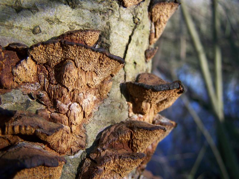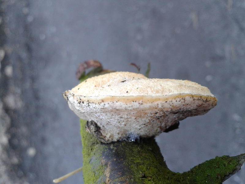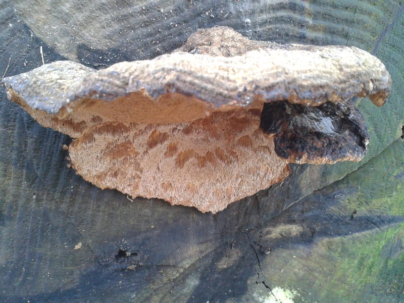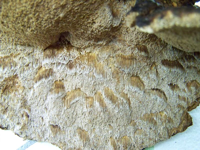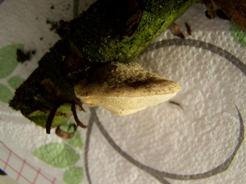 Ein anderer Fund wuchs sehr anders. Vom Habitus ähnelt er meinem ersten Fund sehr (langgezogene Poren beim Hinunterwachsen am Stamm, Farbe), doch er wuchs sehr viel weniger kompakt, sondern eher verstreut und dementsprechend auch kleiner
