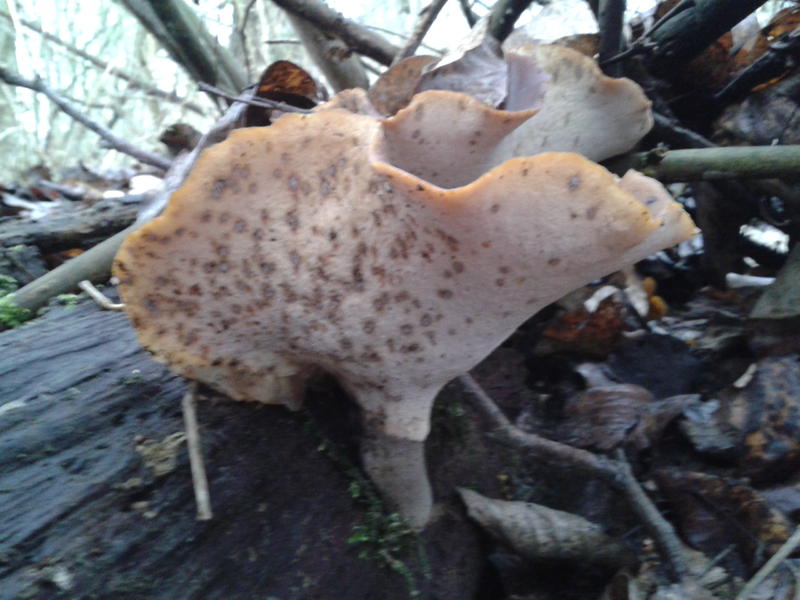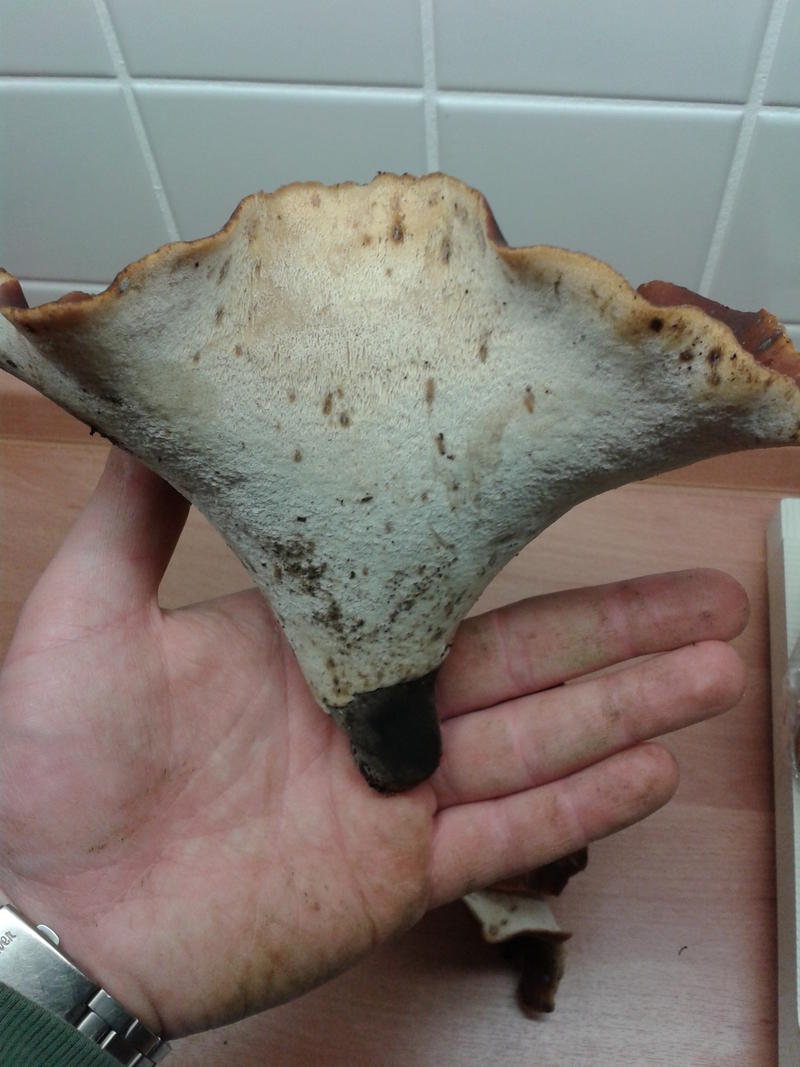 Für alle, die bis jetzt durchgehalten haben, kommt mein persönliches Highlight: Mein Erstfund des Kastanienbraunen Stielporlings (Polyporus badius). Was ein Monsterpilz, gut versteckt unter kiloweise Totholz (daher das erste Bild am Holz unscharf). Insgesamt waren es 4 Pilze, der größte von ihnen besaß einen Hutdurchmesser von etwa 15 cm.