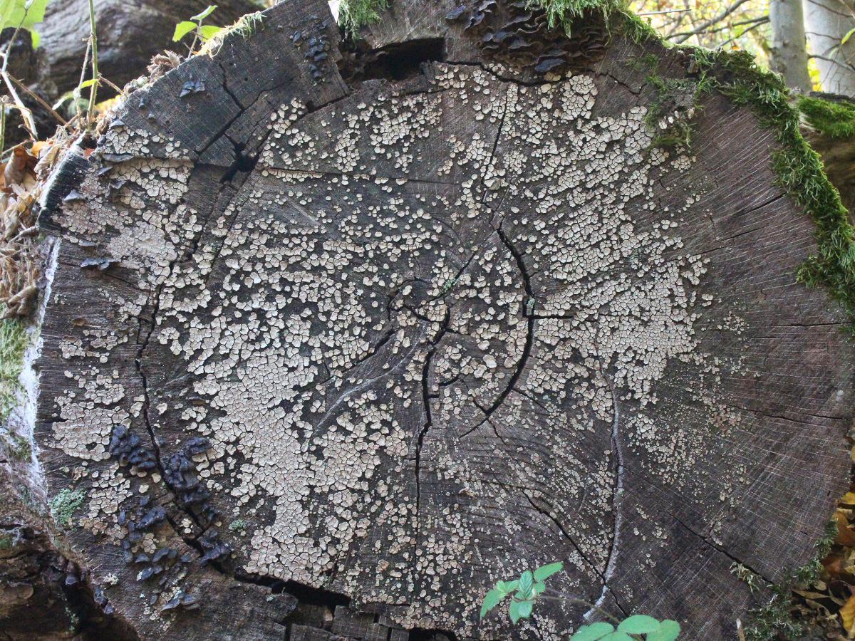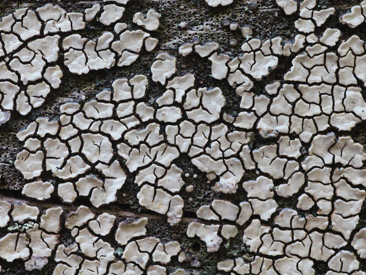 Und hier noch was Interessantes. Wikipedia erwähnt, dass das Lignin durch diesen Pilz ungleichmäßig abgebaut werden und deshalb typischerweise kleine Löcher entstehen. Die kann man hier erkennen.