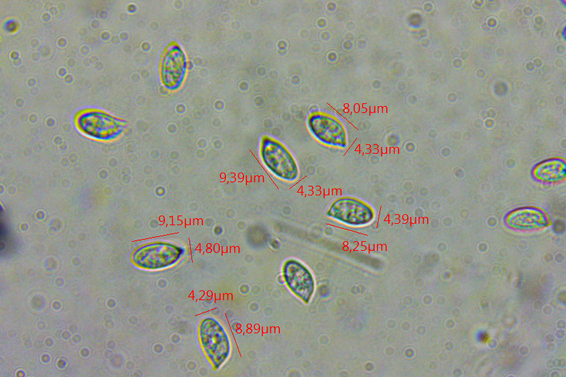 Clitopilus scyphoides (var. scyphoides) als Typusart ist wie Clitopilus scyphoides var. intermedius eine Art mit Trichterlingshabitus (vgl. Bilder in PdS - Band 4). Unsere Fruchtkörper waren 5 bis 12 mm im Durchmesser und hatten einen Nabelingshabitus. Clitopilus scyphoides var. reductus hingegen ist eine spatelförmige Art mit reduziertem Stiel und Sporen unter 7(-8) µm.