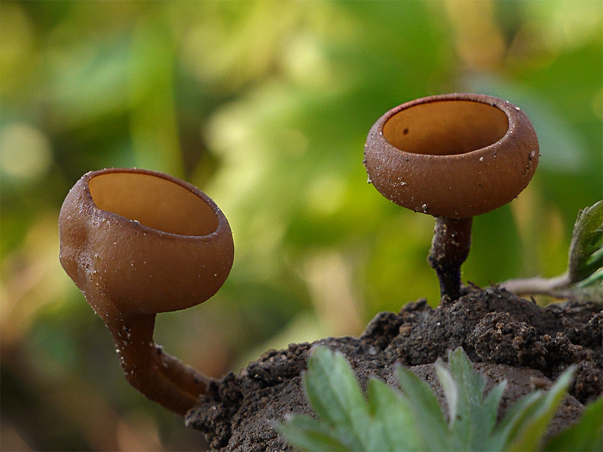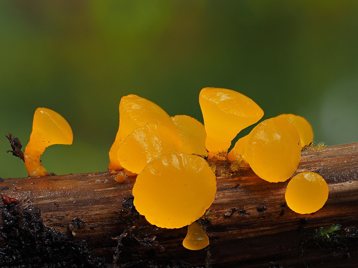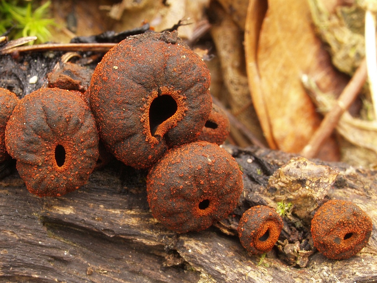 Die vermeintlichen Becherlinge sind auch Schleimpilze, nämlich Blutmilchpilze. Gerade diese Oberflächenstruktur mit schuppenähnlichen Elementen ist ganz typisch in dem Stadium. Von der Form her könnte ich mir da sogar eingefallene Lycogala conicum vorstellen.