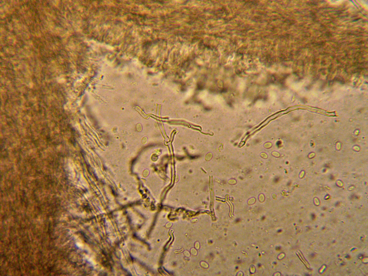 Ich weiß zwar nicht, ob die Trennlinie, die man dort sehen kann, die beschriebene Trennlinie ist, weil es eher wie eine beginnende Fäule aussieht und ich sie eher in der Trama und nicht den Röhren erwartet hätte, aber auch ansonsten passte alles ganz gut. Die Färbung auf Druck, die Sporen, die Skeletthyphen mit Schnallen, fehlende Reaktion mit Melzer. Robinie als Substrat ist zwar nicht unbedingt beschrieben, aber durchaus zu erwarten.