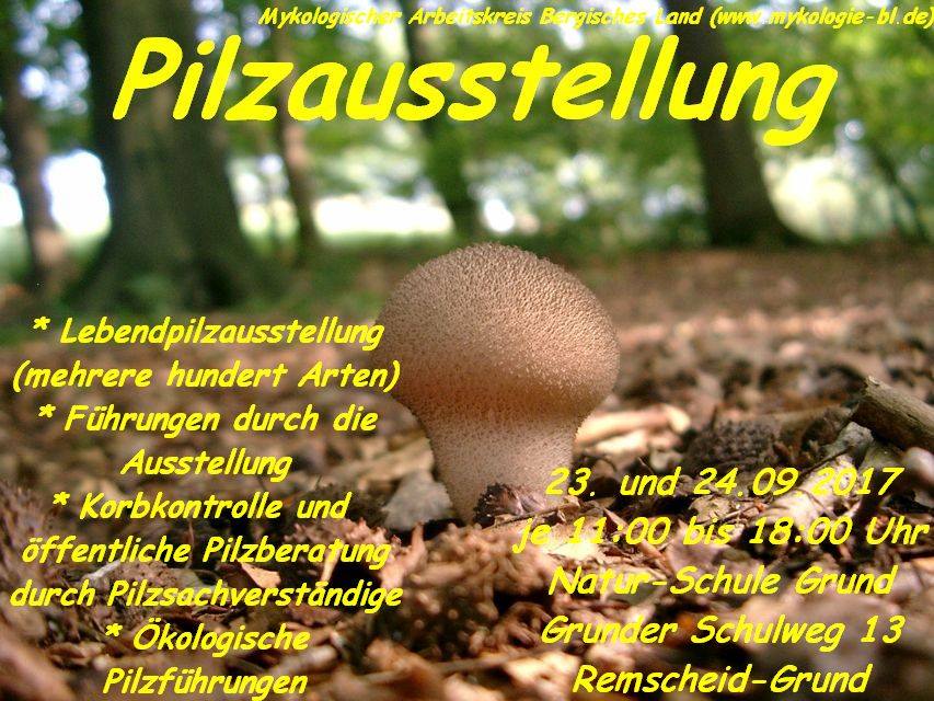 Und dann gibt es noch eine Ausstellung in der Naturschule Grund in Remscheid. Dazu gibt's nen kleinen Flyer mit den wichtigsten Daten. Auch hier werden Pilze aus der Umgebung präsentiert und - bei Bedarf - erklärt, dazu werden Korbkontrollen und zwischendurch kurze Führungen ins benachbarte Naturschutzgebiet angeboten.