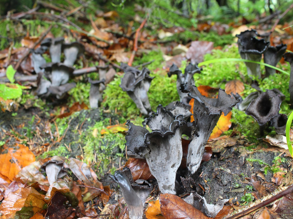 Bisher erst einmal gesehen hatte ich die meines Wissens eher kalkliebenden Totentrompeten (Craterellus cornucopioides). Es sollte an dem Wochenende nicht das letzte Mal bleiben.
