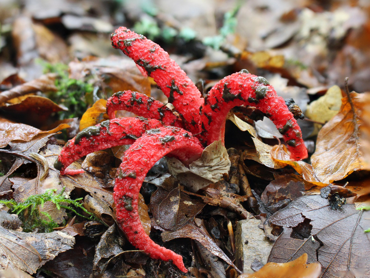 Bereits auf dem Rückweg, sofern man das bei einem Rundweg sagen kann (Mann, hatten wir getrödelt...), meldete Hans Tintenfischpilze (Clathrus archeri). Neben dem einen Exemplar am Wegesrand wuchsen eine Etage tiefer noch weitere richtig schöne Exemplare, die meisten waren allerdings noch im Eierstadium. Ich will nicht wissen, wie es jetzt dort aussieht und ... riecht.