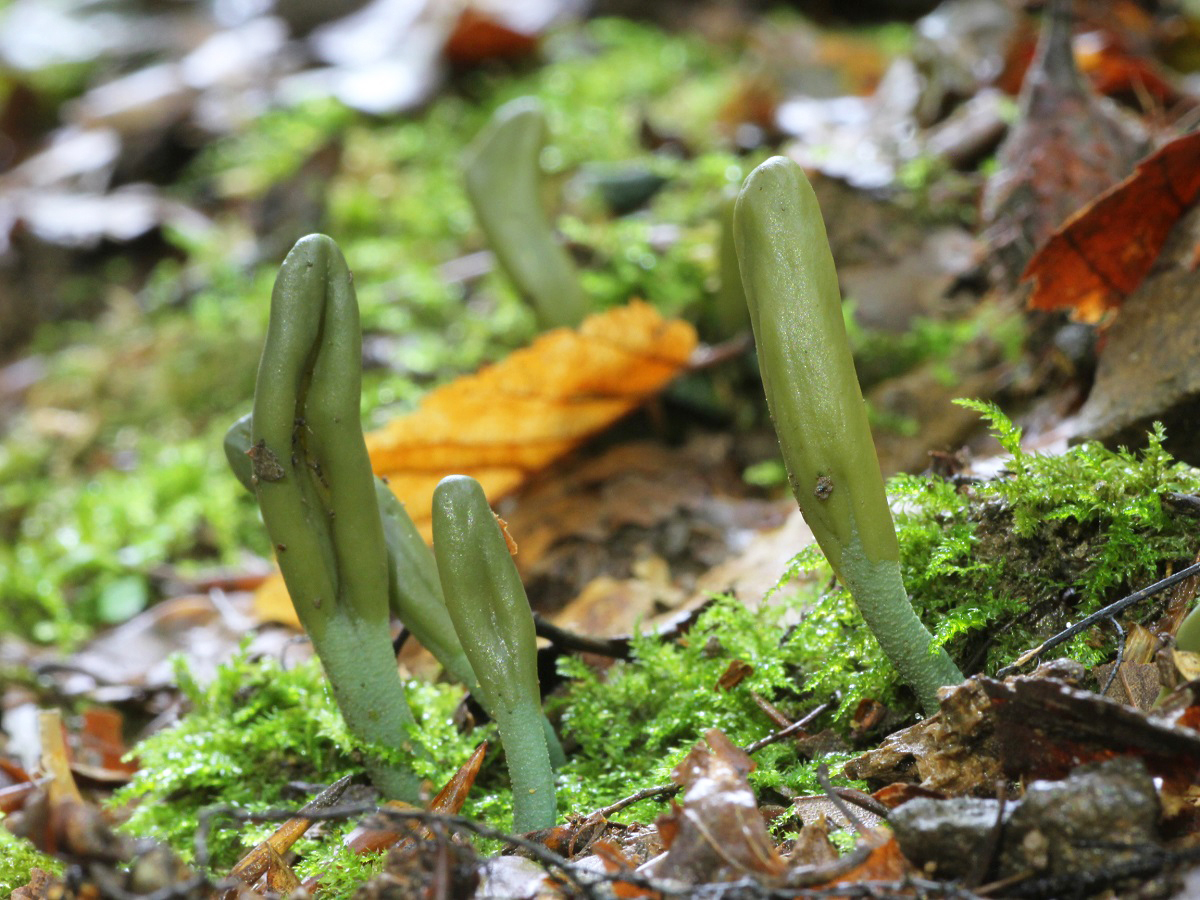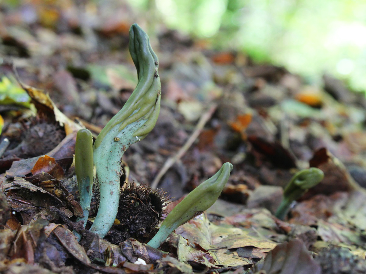 Ein weiterer Schrei ertönte schließlich bei einem Fund, auf den ich insgeheim schon die ganze Zeit gehofft hatte. Lehmige Hänge unter Buchen sind ideal für die nicht häufige Graugrüne Erdzunge (Microglossum griseoviride) - noch nicht mikroskopisch abgesichert, aber eigentlich klar. Die kannte ich bisher nur von Ralf.