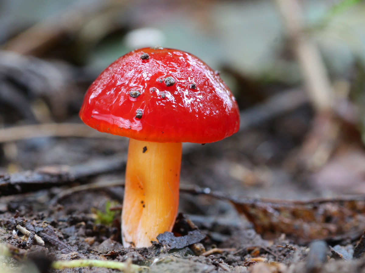 Ein Stück weiter wuchsen dann am Wegrand Saftlinge, die sehr nach dem Kirschroten Saftling (Hygrocybe coccinea) aussehen. Die muss ich aber auch noch absichern. Hier ein einzeln stehendes, junges Exemplar.