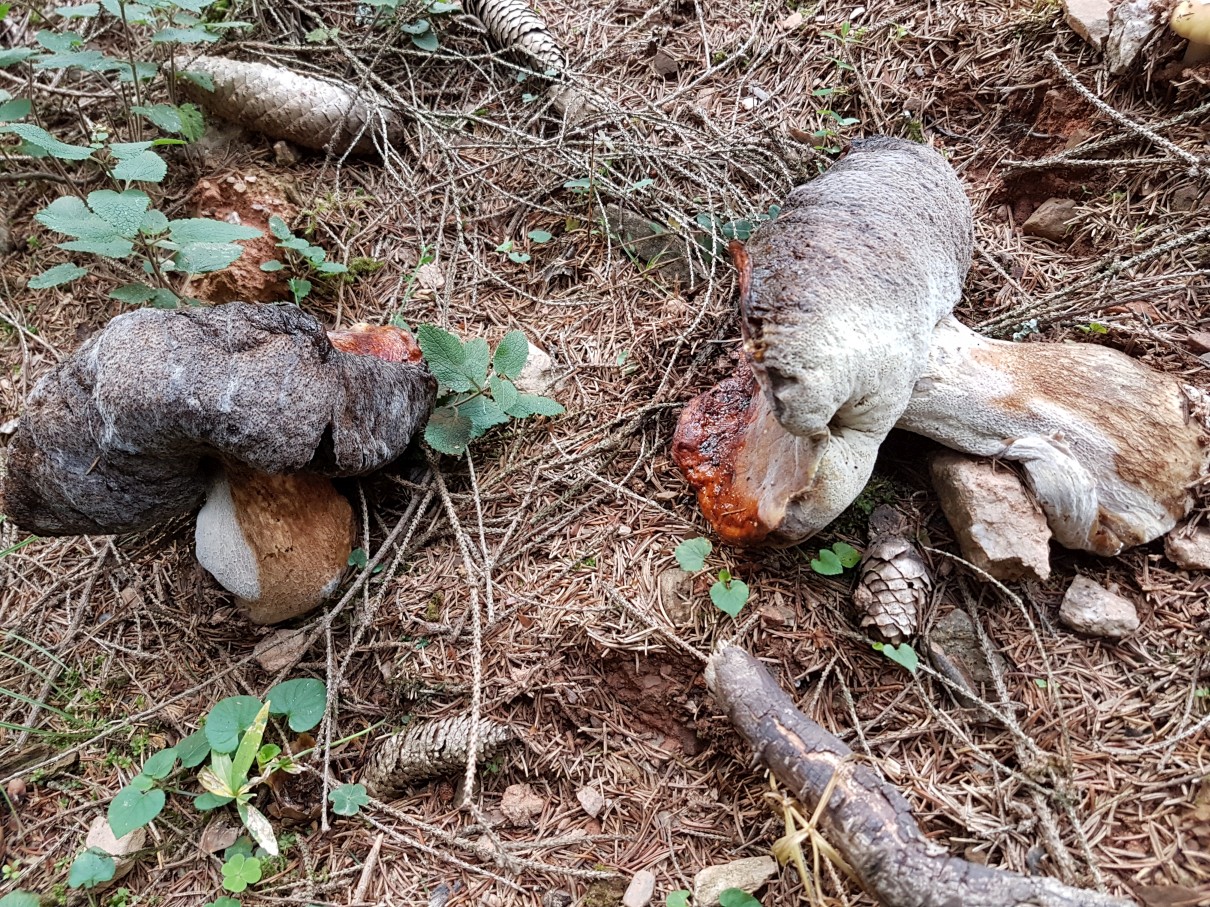 3) Drei Gallenröhrlinge und ein weiterer Röhrling (rechts - kein Netz), den ich spontan nicht sicher einordnen kann.